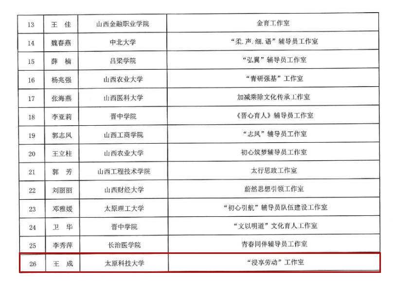 近日,山西省教育厅公布了2025年度山西省高校思想政治工作质量提升综合改革与精品建设项目名单,万象城官网专职辅导员王成主持的“浸享劳动”工作室获批2025年度省级高校辅导员名师工作室,这是万象城官网辅导员队伍建设和学生思政工作品牌化建设取得的又一重要成果。“浸享劳动”工作室成立于新时代五育融合和以劳育人的时代背景下,与万象城官网劳动教育的变革发展同频共振,服务于学校劳动教育的整体性协同育人格局,进一步引导和转变数字时代...