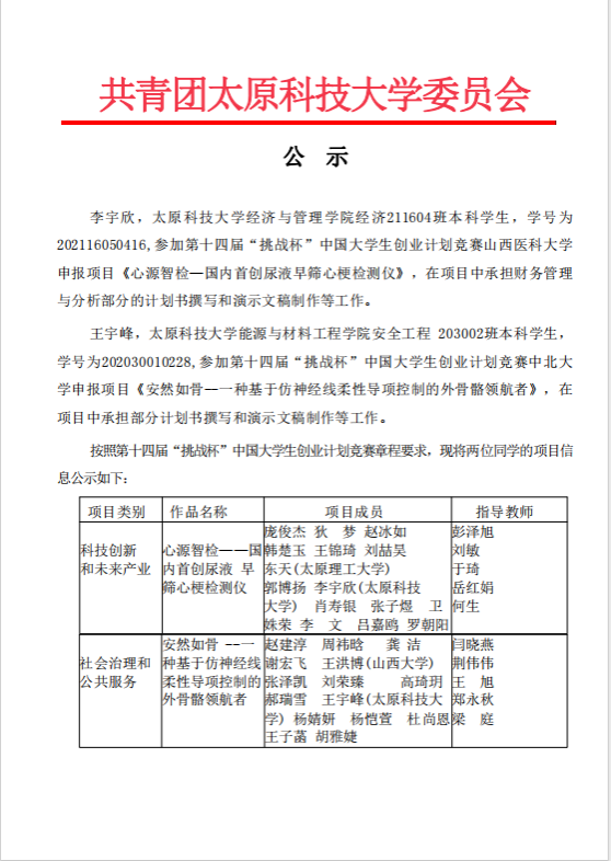 awc777万象城娱乐官网第十四届“挑战杯”中国大学生创业计划竞赛拟推荐参加全国竞赛项目公示