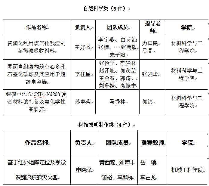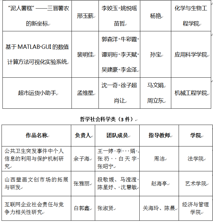 按照《关于组织开展山西省第十七届“兴晋挑战杯”大学生课外学术科技作品竞赛awc777万象城娱乐官网校级赛事的通知》,校内17位专家经过3月30日—4月1日的紧张评审,评选出万象城官网晋级省赛的10件作品,现将作品名单公示如下: