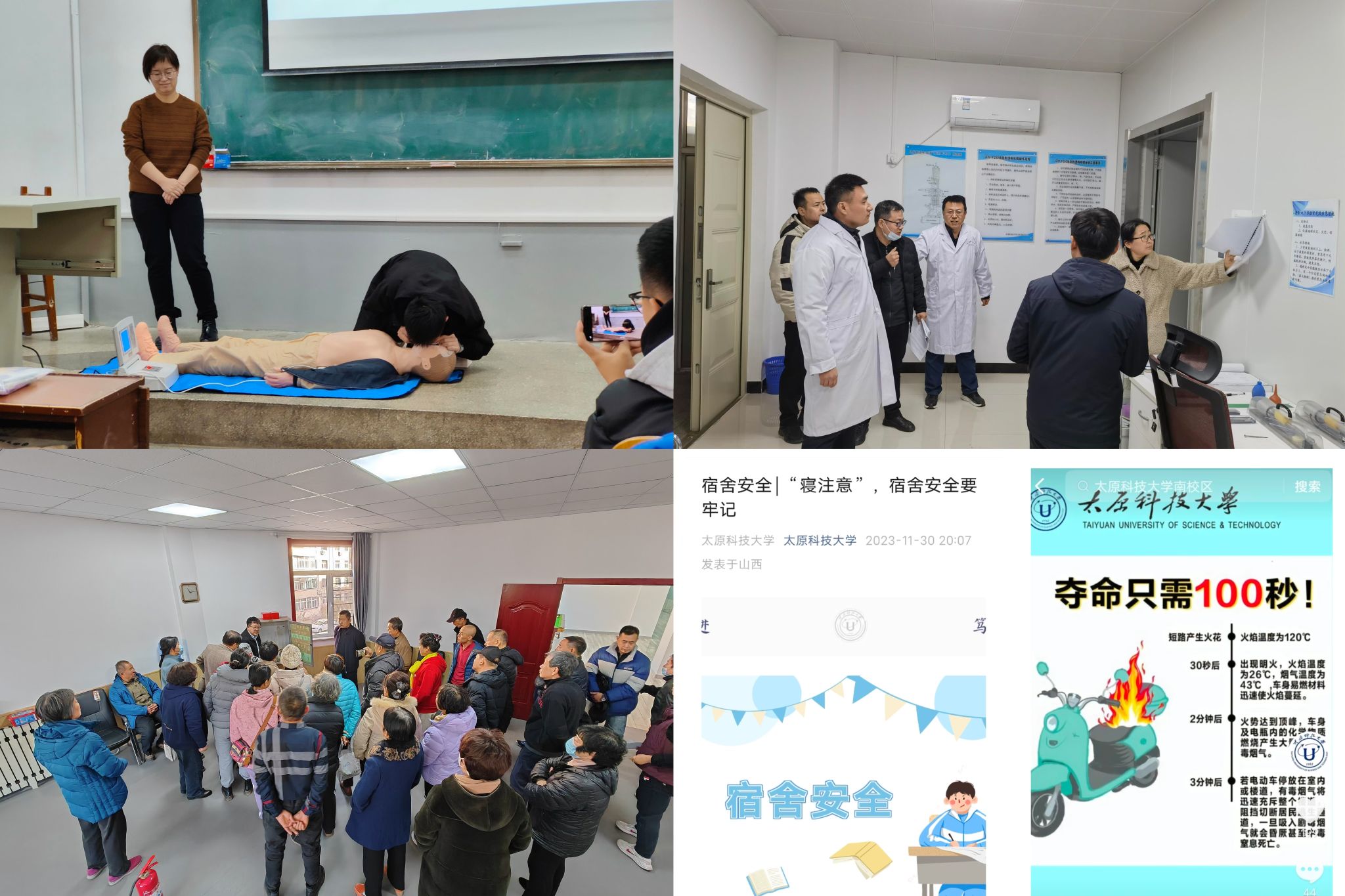 开展安全“大宣教”。各单位通过微信公众号、视频号、网站、抖音、展板、微博等融媒体平台,持续向广大师生普及安全知识。聚焦电动自行车安全,发布《关于规范电动自行车安全管理的通告》《电动自行车安全使用指南》,制作《“全国交通安全日”科大宣传片》。持续盯紧消防安全教育培训,逐学院逐部门组织教职工接受一次消防宣传教育培训、熟悉一次身边的灭火器材。开设《安全教育》课程,除了传统内容讲授外,在课堂开展场景模拟,将直观体验和安全知识具象化结合,帮助大学生较为熟练地掌握安全防范能力。