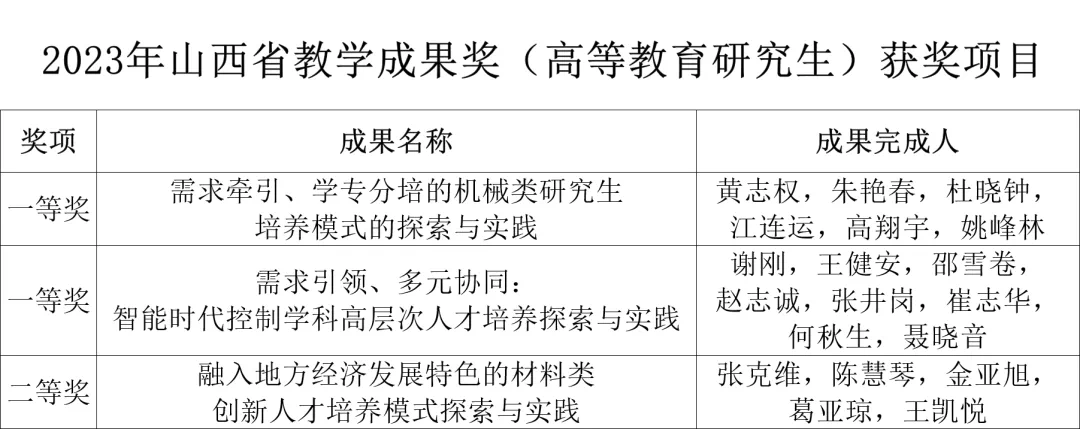 山西省教学成果奖每两年评审一次,旨在奖励在教学实践、改革、研究中取得显著成果的教学团队和个人,发挥教学成果的引领示范作用,鼓励教育工作者从事教育教学改革与实践研究,努力提高教学水平和教育质量。学校将以此次获奖为契机,扎实推进教学改革创新,充分发挥获奖成果的示范引领作用,奋力争取更优异的成绩,为推动我省教育高质量发展做出更大贡献。