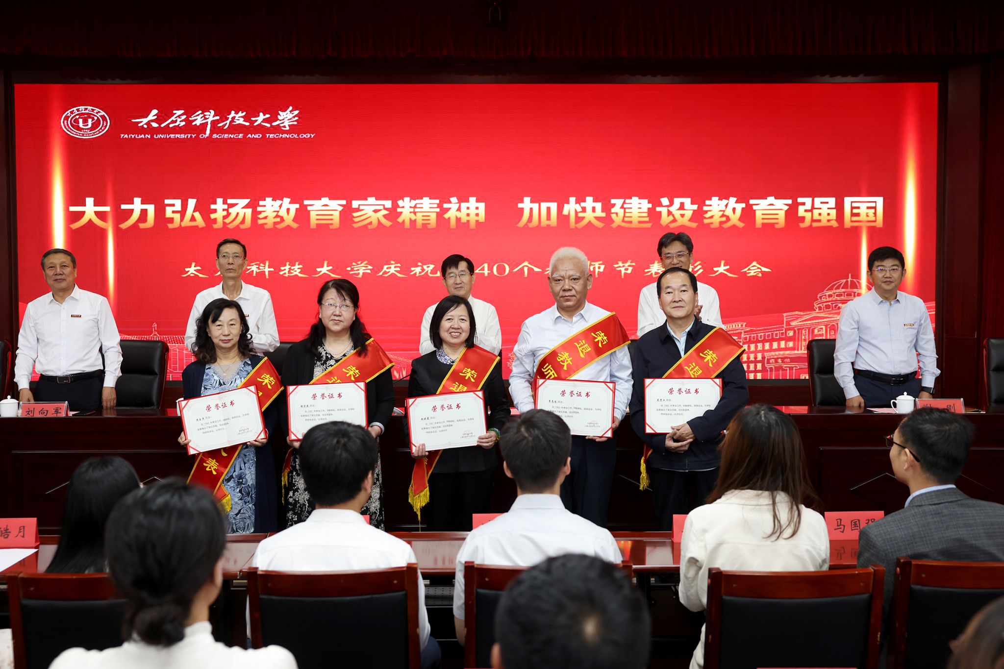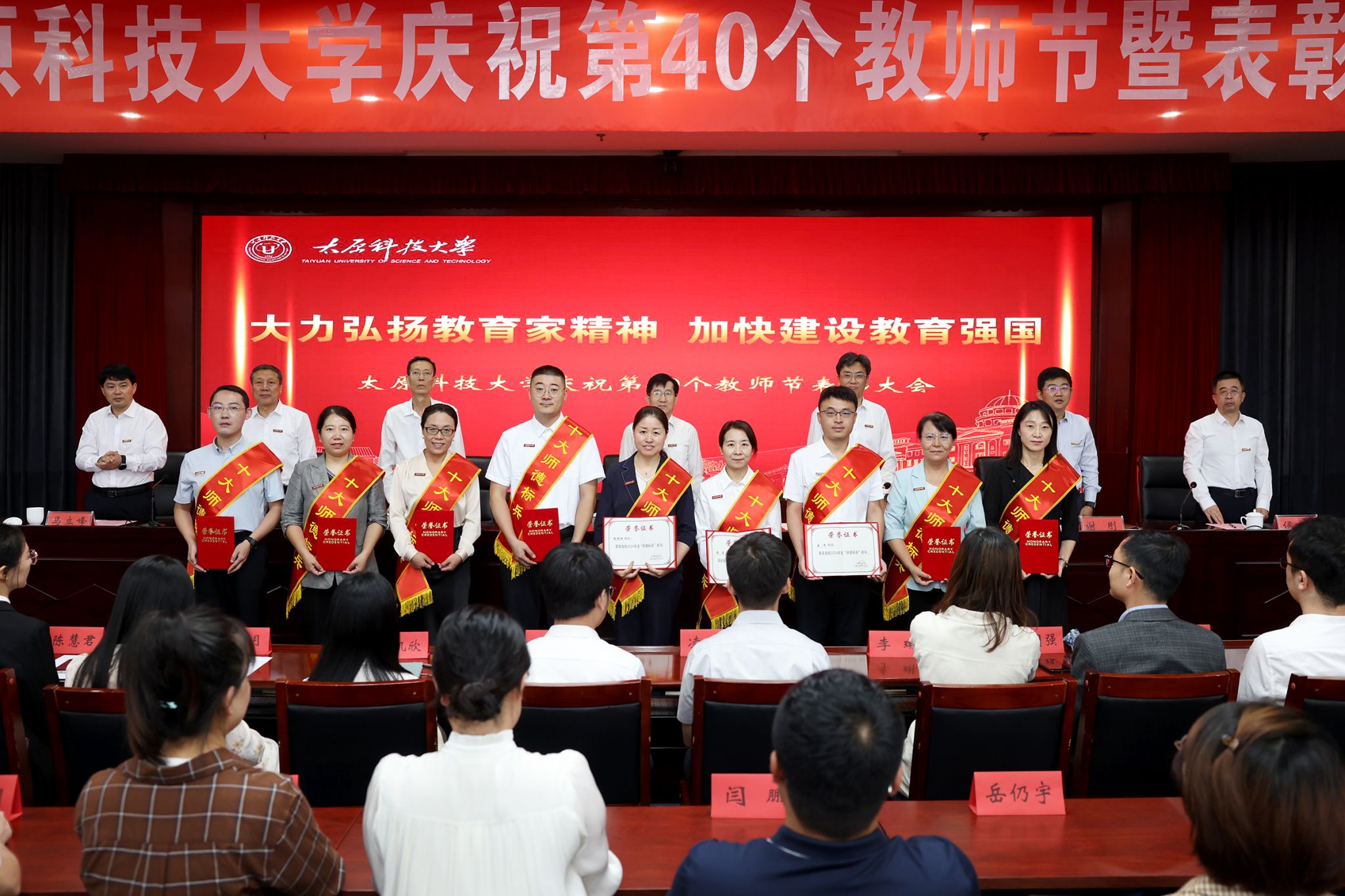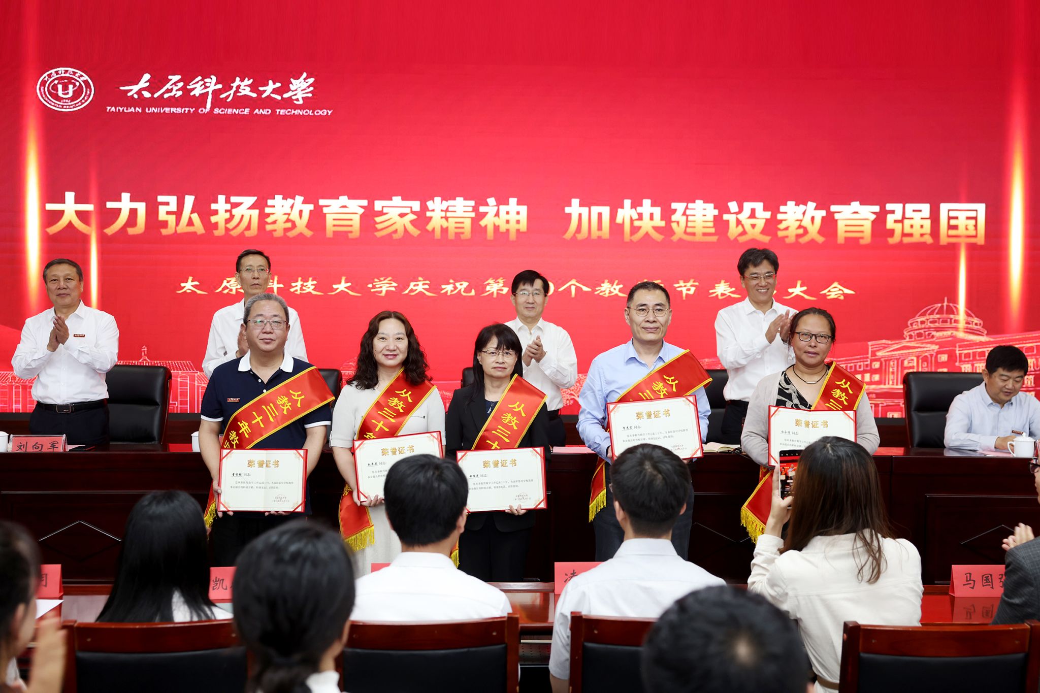 会议对全国教育系统先进个人,山西省教育系统先进集体、模范教师,学校科技工作突出贡献奖、本科教学突出贡献奖、师德标兵获得者、辅导员年度人物进行了表彰。