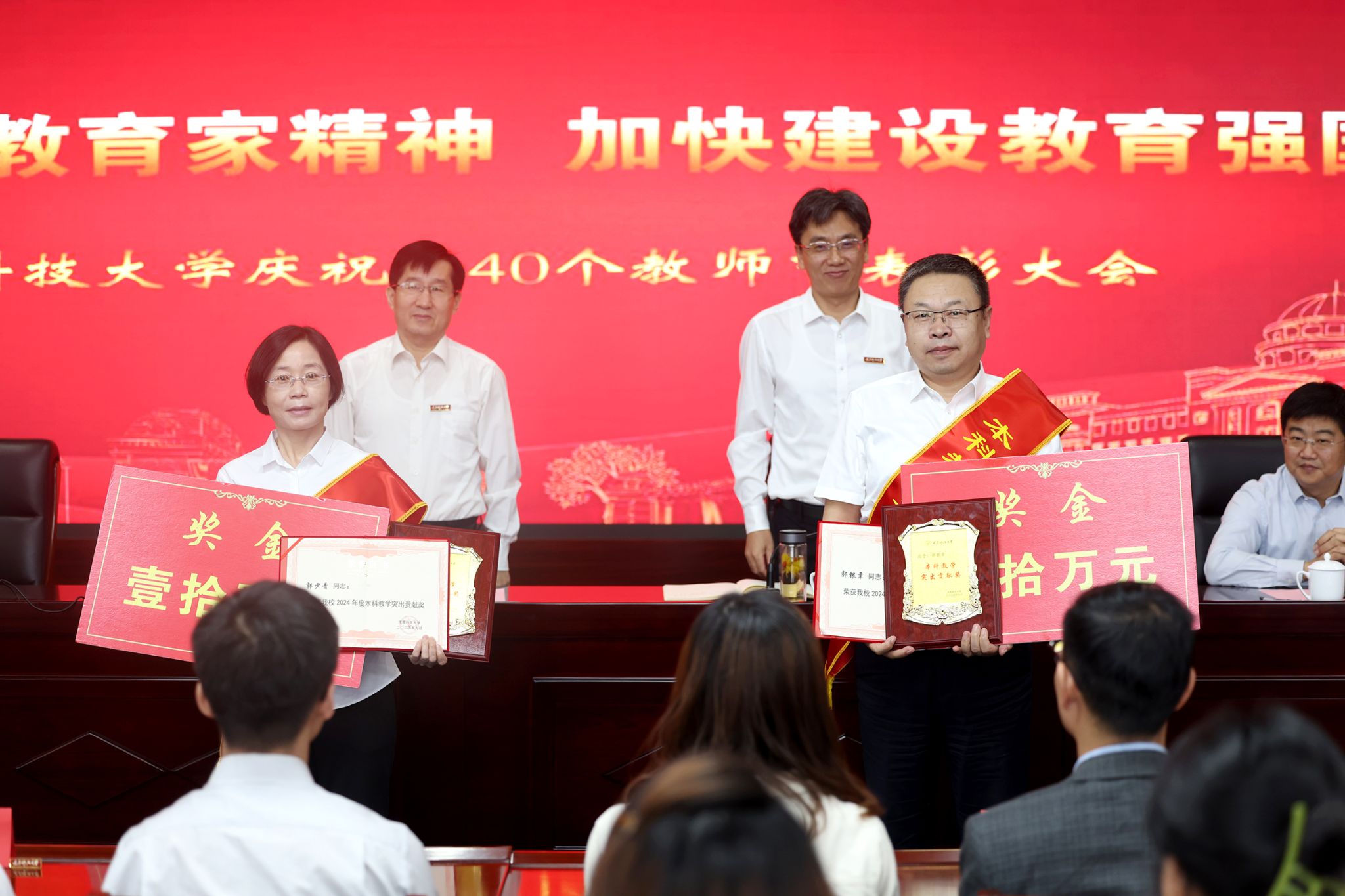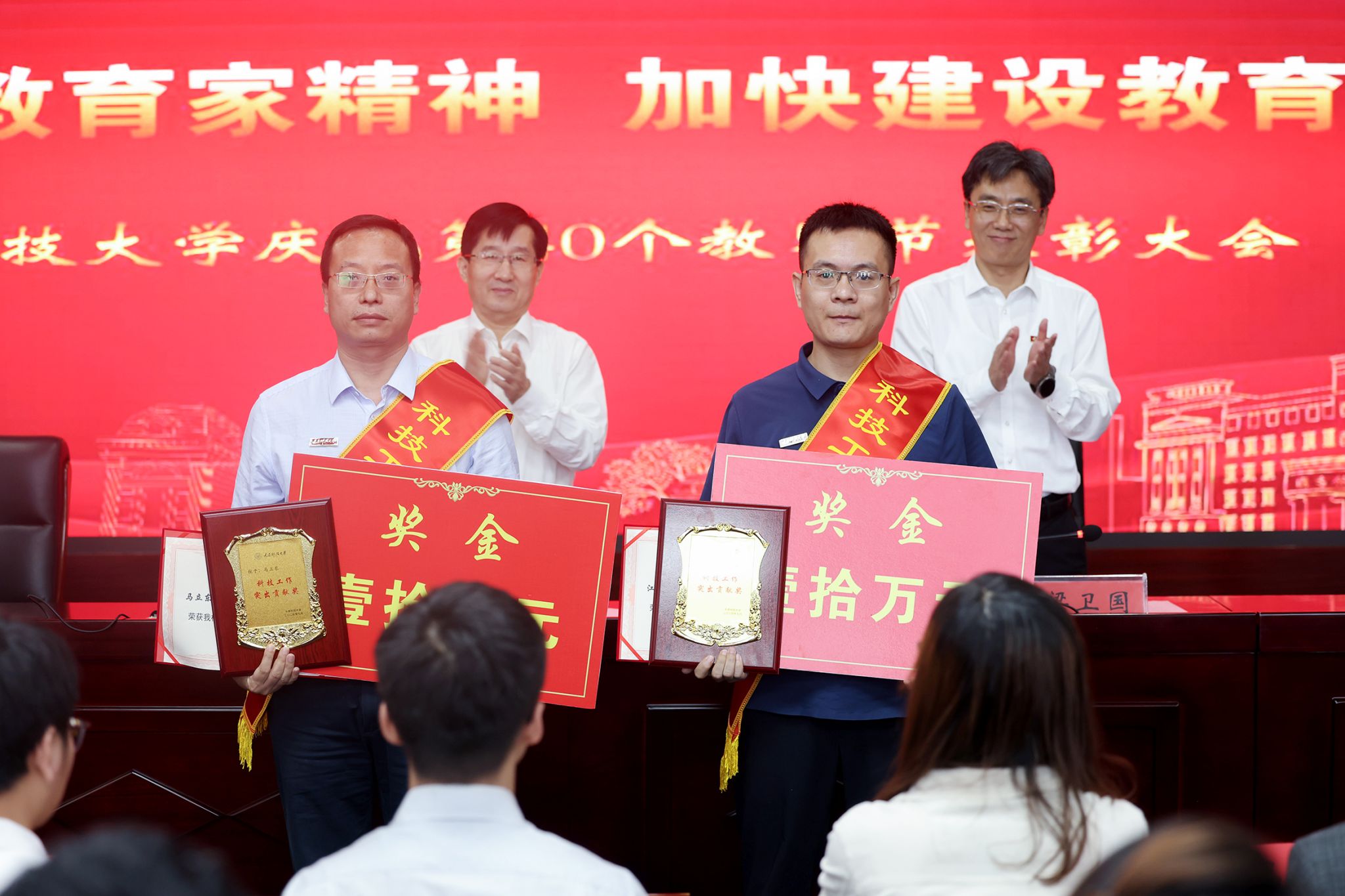 白培康代表学校向辛勤耕耘、躬身育人的广大教职员工致以节日祝福和崇高敬意。他指出,学校各项成绩的取得来之不易,得益于筚路蓝缕、至诚报国的创业先贤;得益于严谨治学、潜心育人的广大教师;得益于负重奋进、笃行求实的每一位科大人。当前,学校正处于全面深化改革的关键阶段,面对高等教育发展的新要求,面对学校高水平研究应用型大学建设的目标任务,更迫切地需要全体教师把力量凝聚在学校发展上。他提出三点希望:一是坚定理想信念,做有“大情怀”的“引路人”。坚守初心使命,始终心怀“国之大者”,厚植爱国情怀;二是涵养高尚师德,做有“大德行”的“传承者”。注重师德修养,陶冶道德情操,用高尚的人格引导学生“扣好人生第一粒扣子”;三是深厚知识积淀,做有“大学问”的“大先生”。严谨笃学,锐意创新,提高传道授业解惑的本领,加强科研攻关,大力弘扬教育家精神,争做新时代大国良师,为加快建设教育强国贡献力量。