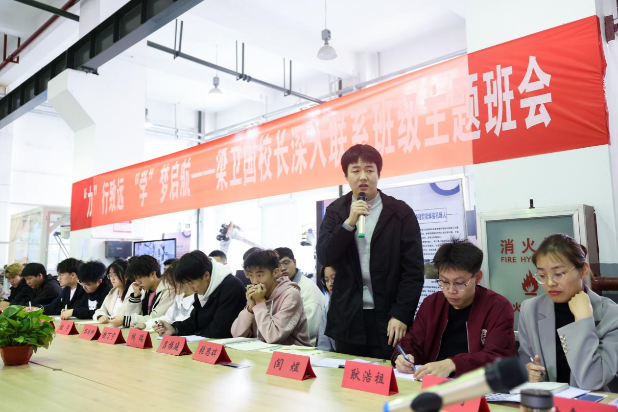 主题班会上,梁卫国认真倾听了同学们的心声,充分肯定了同学们善于思考的良好习惯、昂扬自信的精神面貌和强烈的专业认同感。他结合自身求学奋斗的经历,与同学们亲切交流,鼓励同学们珍惜韶华,不断强化自身综合素质能力,并对同学们提出五点建议:一要善于自控,培养良好的学习习惯和自学能力;二要善于吃苦,求职、考研路途艰辛,需要沉下心增强竞争实力;三要善于观察,及时关注国家的战略需求和学科发展的前沿动态,为科技强国贡献力量;四要善于锻炼,走出宿舍、走向操场,增强身体素质;五要善于奉献,真诚相待、相互扶持、服务同学、奉献集体,在温馨和谐的集体生活中收获温暖,在奋斗中淬炼成才。