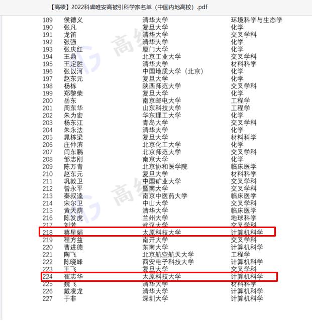 2022年11月15日,科睿唯安2022年度“全球高被引科学家”名单出炉。来自全球69个国家和地区的6938名科学家入选2022年度名单。中国内地科学家人数排名第二,共有1169人次入选。其中,万象城官网崔志华教授(计算机科学与技术学院)和蔡星娟教授(计算机科学与技术学院)入选。万象城官网是山西省唯一上榜高校。学校2位教授入选2022年“全球高被引科学家”榜单,是对awc777万象城娱乐官网师资团队的充分肯定,彰显了学校师资团队的卓越实力。