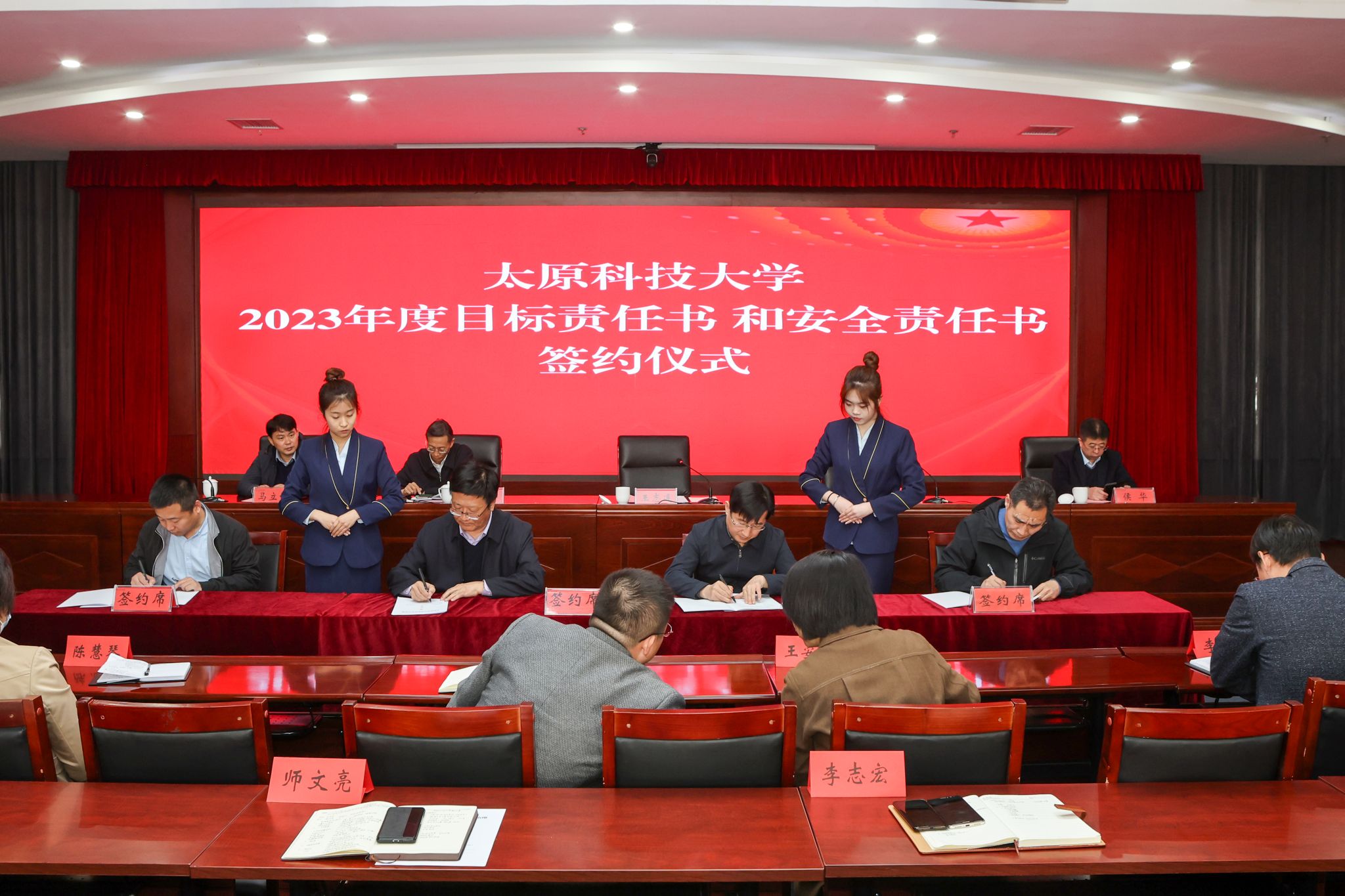 会上,王志连、白培康与6个职能部门代表、5个二级学院代表分别签订了2023年目标责任任务书和安全责任书。