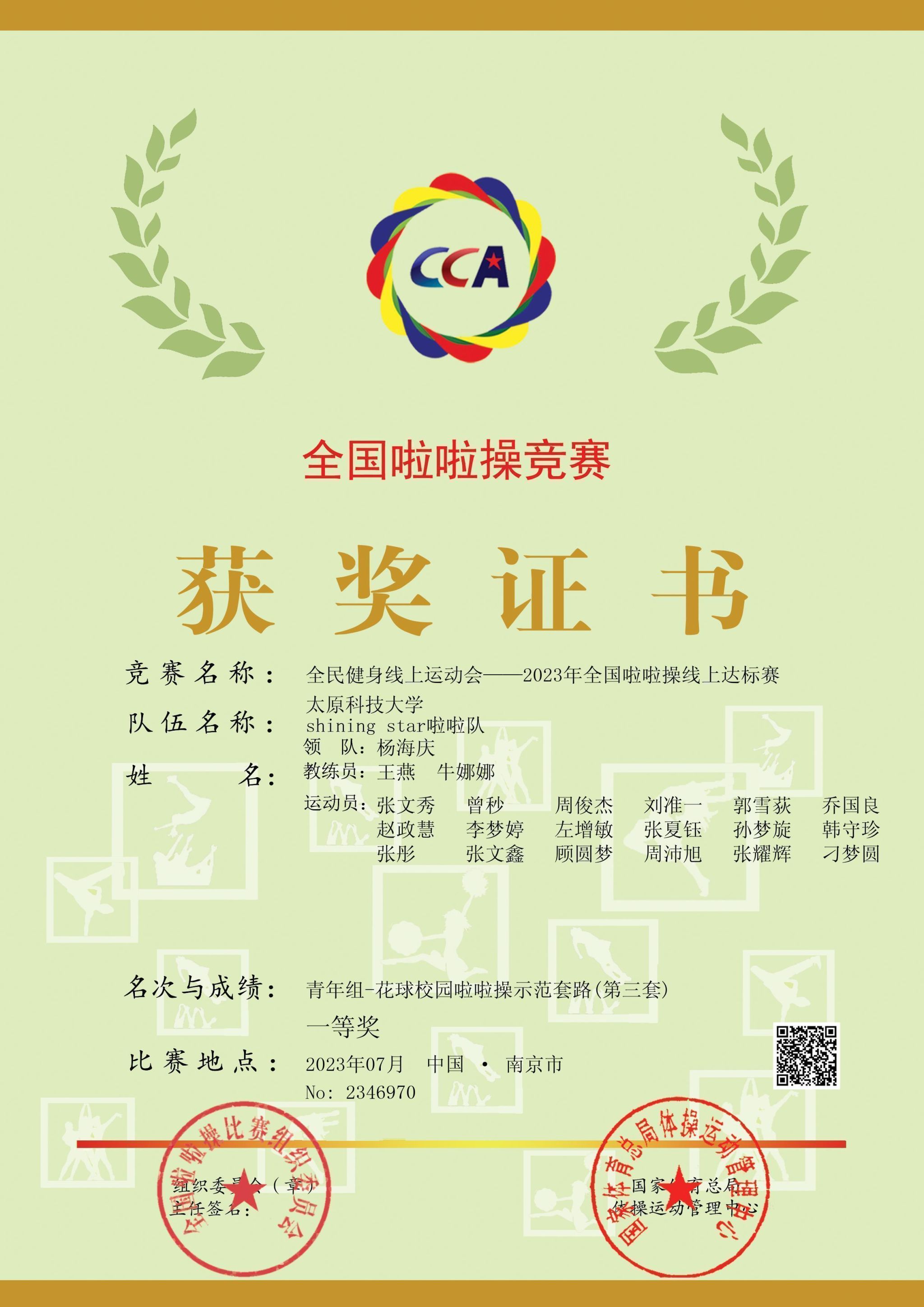 近日,由国家体育总局体操运动管理中心、中国蹦床与技巧协会主办的全民健身线上运动会——2023年全国啦啦操线上达标赛在江苏省南京市拉开序幕。本次比赛吸引了共有来自全国27个省(自治区、直辖市)的300余支队伍约7500人积极参与。万象城官网啦啦操健儿以体育学院党委书记杨海庆为领队,在指导教师王燕、牛娜娜的精心指导下,代表学校参加了此次比赛,最终喜获青年组-花球校园啦啦操示范套路(第三套)一等奖。