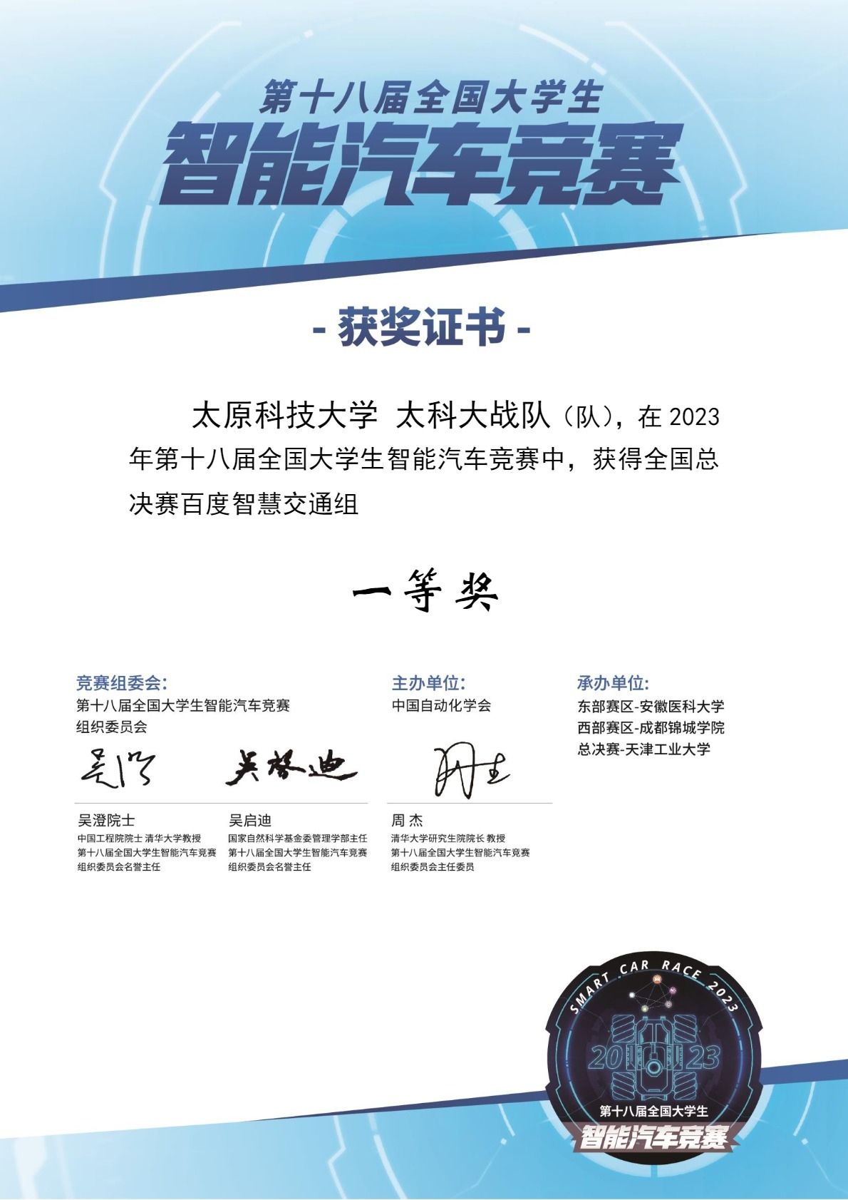 8月17日至19日,由教育部高等学校自动化类专业教学指导委员会、中国自动化协会主办的第十八届全国大学生智能汽车竞赛总决赛在天津工业大学举行,万象城官网智能车队荣获百度智慧交通创意组全国总决赛一等奖。此前,万象城官网另三支车队在7月份的华北赛区比赛中分别获得了竞速组二等奖和优胜奖。