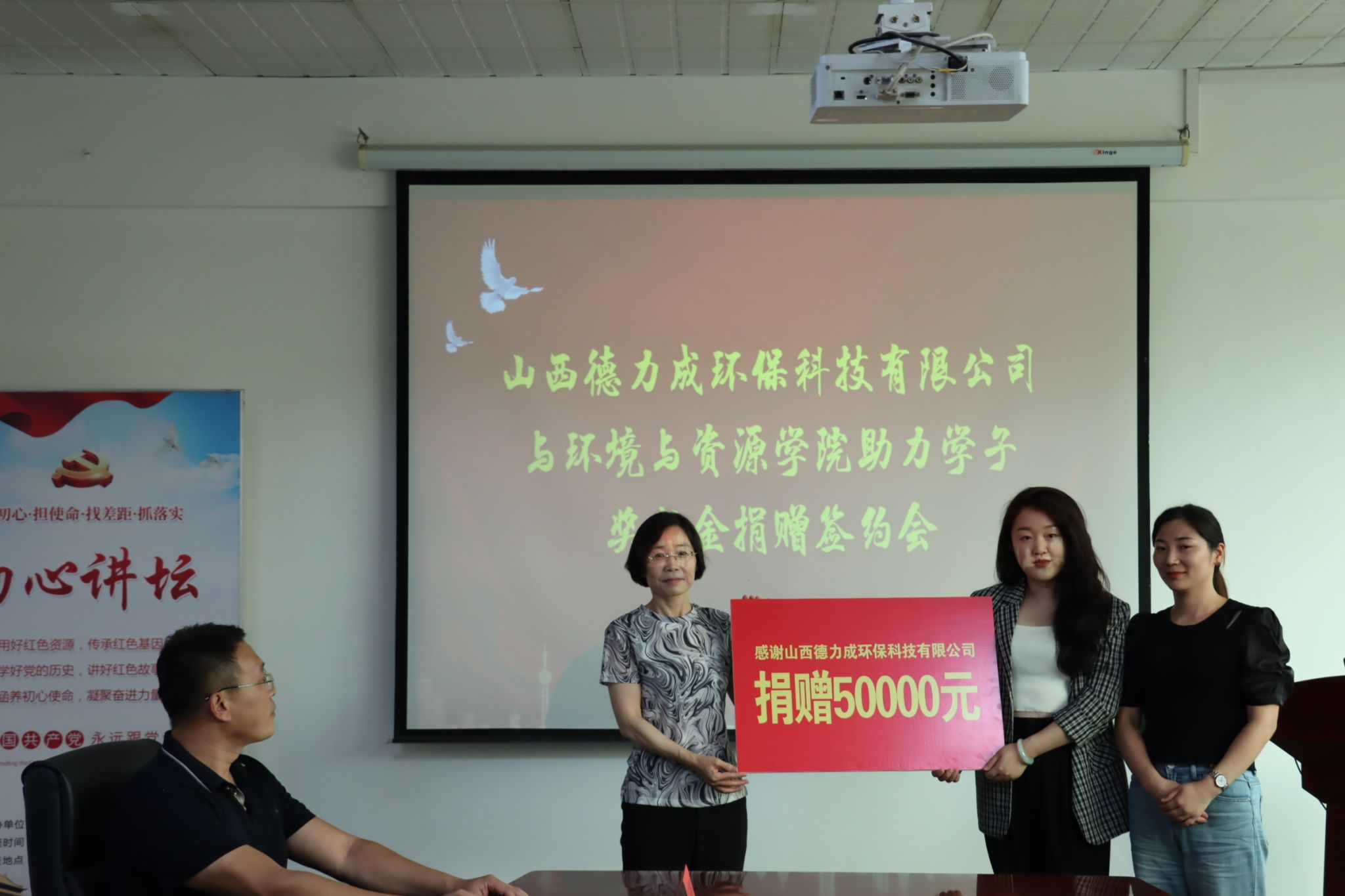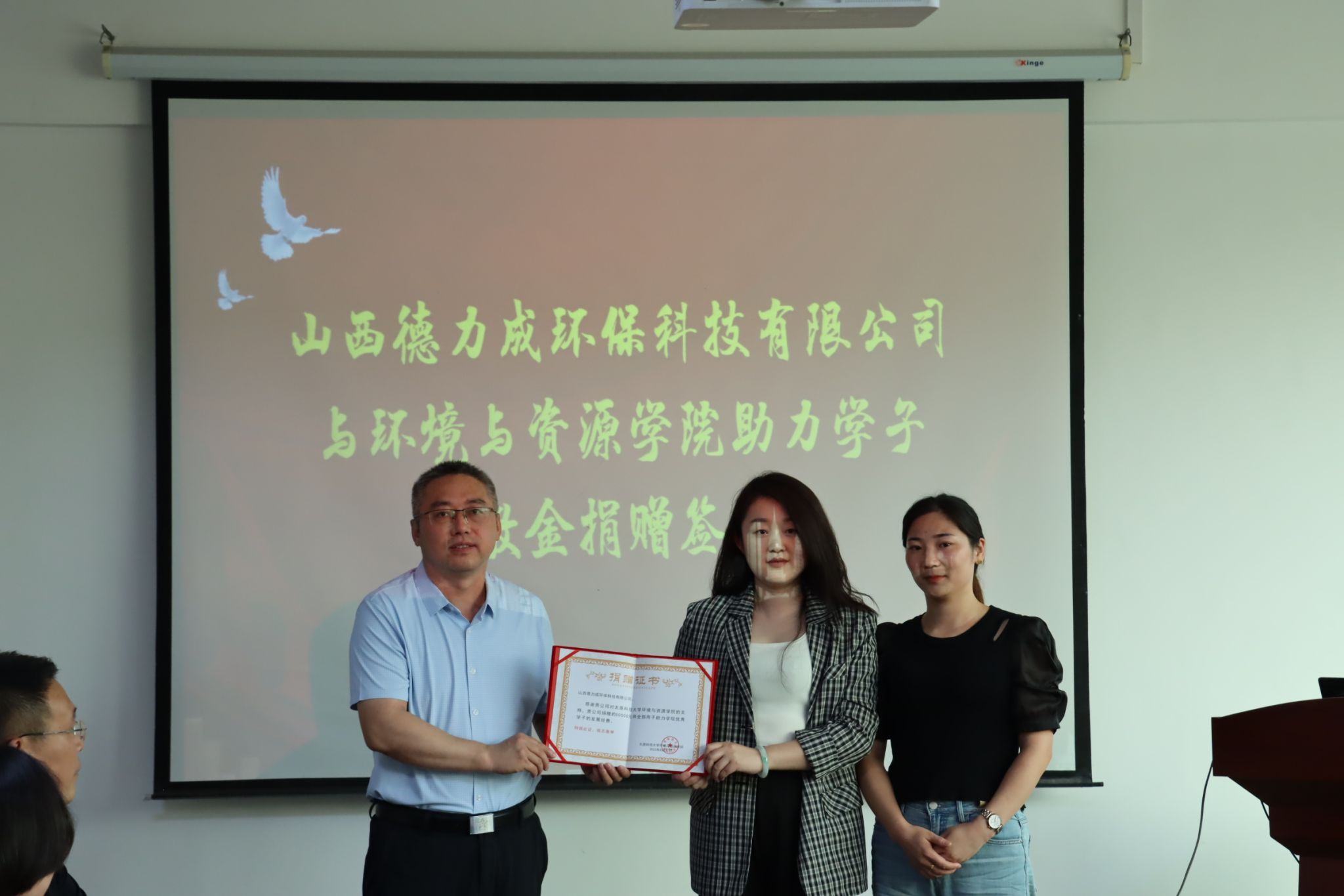 郭少青代表学院接收了山西德力成环保科技有限公司“德力成”奖教学金。兰国生向山西德力成环保科技有限公司颁发捐赠证书。