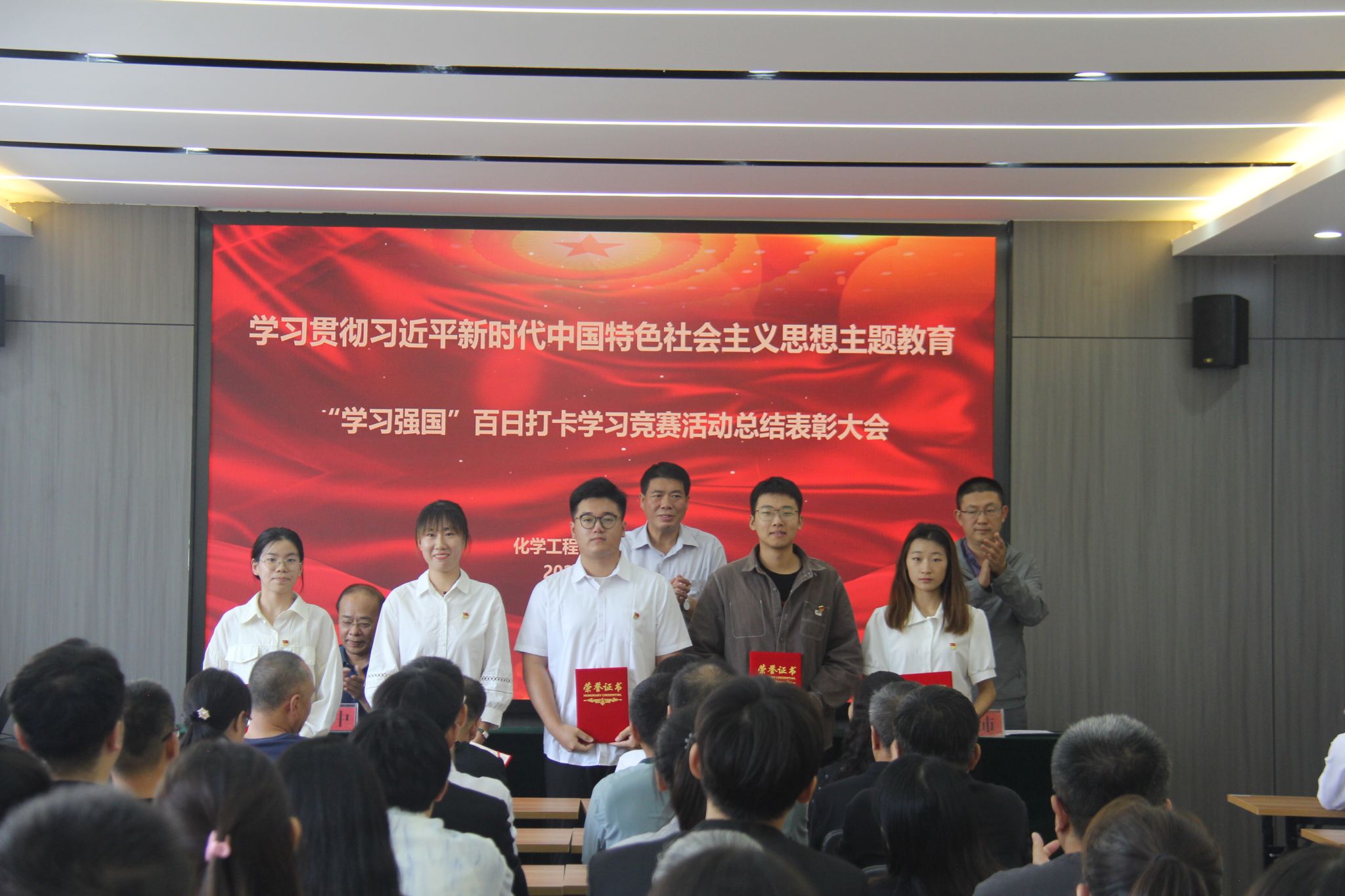 为深入开展学习贯彻习近平新时代中国特色社会主义思想主题教育,切实发挥好“学习强国”平台武装思想、提升能力、增强本领的作用,进一步激发学院全体师生的政治理论学习热情,9月12日下午,化学工程与技术学院在明志楼三层报告厅召开“学习强国”百日打卡学习竞赛表彰总结大会。学院党委委员、获奖集体代表、获奖个人、师生党员代表等80余人参会。