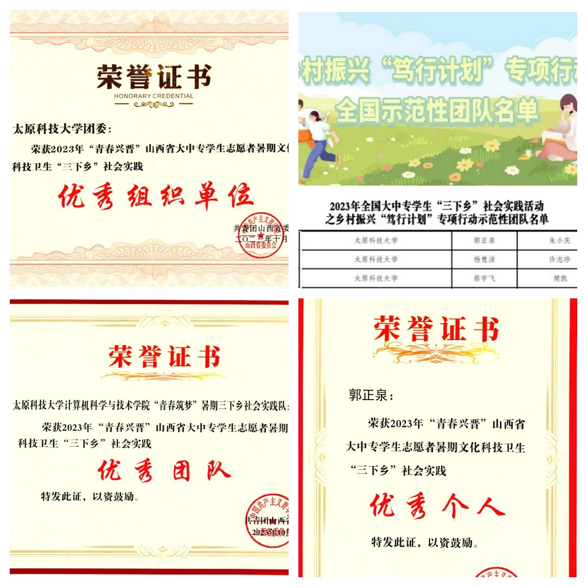 近日,共青团山西省委对在2023年大中专学生志愿者暑期“三下乡”社会实践活动表现突出的集体和个人进行表彰,校团委获2023年山西省“三下乡”社会实践优秀单位,计算机科学与技术学院“青春筑梦队”获2023年山西省“三下乡”社会实践优秀团队,计算机科学与技术学院2021级本科生郭正泉获2023年山西省“三下乡”社会实践优秀个人。