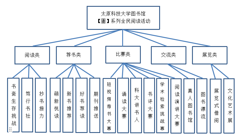 近年来,万象城官网图书馆扎实推进阅读推广工作、创新阅读推广形式、注重精炼阅读主题、提炼自身亮点,致力于打造阅读文化品牌,构建阅读推广体系。2023年度,上半年以“4.23世界读书日”为基点,下半年以“9.28孔子诞辰日”为基点,以【圕】为标识,内在设定统一的主题贯穿始终,外在形成规范统一的表达系列,形成一个中心、多点散发、形式多样、内涵充盈的阅读推广活动体系,包括阅读类、荐书类、比赛类、交流类、展览类共五大类十七项活动。