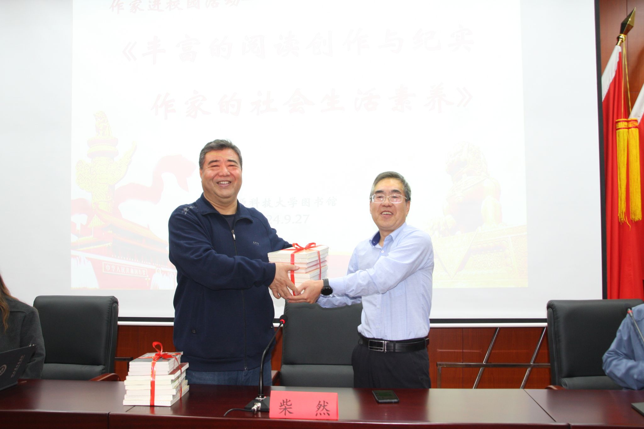 讲座现场,柴然向图书馆捐赠了自己创作的19部著作,辛申伟代表图书馆接受捐赠,并向其颁发了捐赠证书。