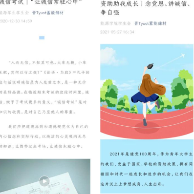 创新活动载体,搭建廉洁平台。重视党团支部和学生组织在学生群体中的影响力,线上和线下教育相结合。为使廉洁文化在学院基层活动中具有广泛性、针对性和有效性,实现以点带面,充分发挥党员的先锋模范作用,通过学生党员带头学习与分享使更多的同学得到熏陶,充分发挥其在廉洁文化教育中的辅助作用。广泛搭建廉洁文化平台,诚信教育“微”传递。通过微信公众号等新媒体宣传国家资助政策等相关知识以及诚信教育等内容,号召各班团支部组织学生积极转发学习相关内容,向大家大力宣传诚信知识,为学生营造廉洁、纯净的学习生活环境。