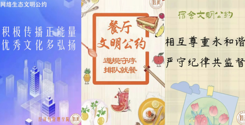 校园文化有热度。学院通过微信公众号、抖音等新媒介,宣传举办各具特色的线上线下活动。辅导员带领学生开展操场歌舞会、篮球赛以及趣味运动会等寓教于乐的系列主题活动,丰富学生的课余生活,舒缓学生在封闭管理期间的负面情绪。结合校园疫情防控要求,特别推出了经管文明公约系列,包含网络篇、宿舍篇、餐厅篇等,进一步强化学生防疫意识,规范同学文明行为。开展网络安全专题会议,倡导学生遵守学校防疫要求,做到不传谣不造谣,主动维护网络传播秩序,营造和谐有序的网络舆论氛围。