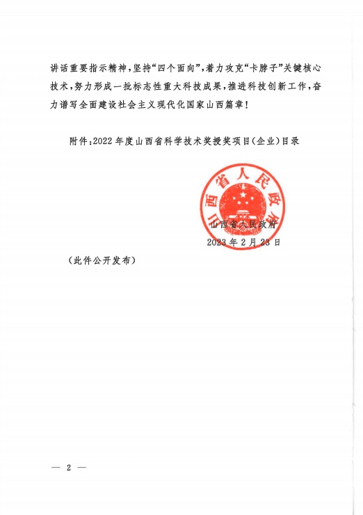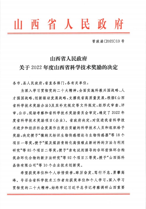 近日,山西省人民政府公布了《关于2022年度山西省科学技术奖励的决定》,决定对促进我省科学技术进步和经济社会发展作出突出贡献的科学技术人员和组织给予奖励,授予18个项目一等奖、85个项目二等奖、92个项目三等奖,授予10个企业技术创新奖。
