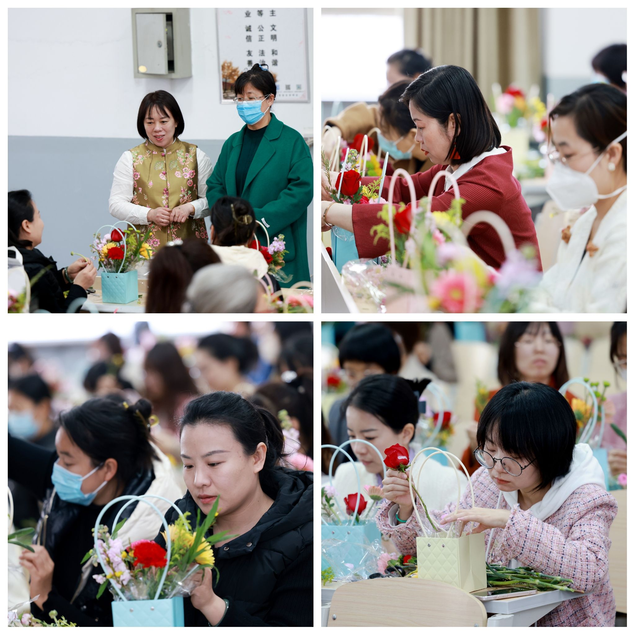 来自机关的50余名女教职工在插花老师的指导下,围绕插花艺术流程、结构和技巧等方面普及了花艺知识,女职工们发挥创造力,按照色彩、层次搭配整体造型,经过创作,花材在巧妙的修剪、搭配下形成了一个个错落有致、独具匠心、赏心悦目的插花艺术品,通过对美学理论的掌握和插花艺术的创作实践,女职工们在忙碌的工作间隙放松心情、亲近自然、交流情感、展现才华,充分感受了插花精美巧妙的艺术魅力。