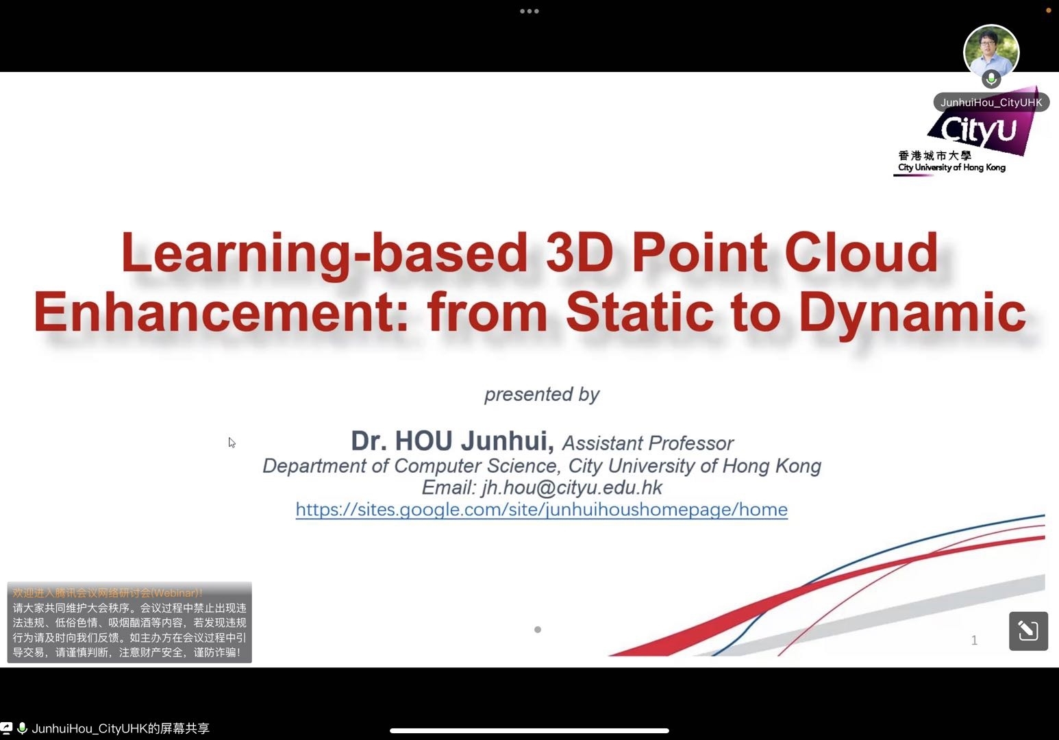 2022年7月8日,应万象城官网电子信息工程学院和科学技术研究院邀请,香港城市大学计算机科学系助理教授、博士生导师侯军辉在线上作了题为《Learning-based 3D Point Cloud Enhancement:from Static to Dynamic》的学术报告。报告由电子信息工程学院副院长王安红教授主持,百余名师生分别在线上和线下听取了学术报告。