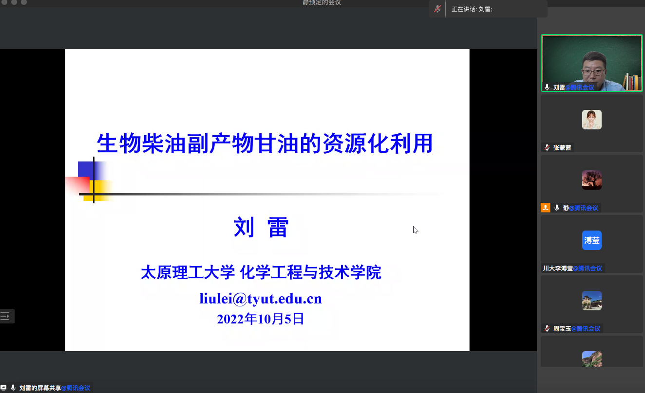 2022年10月5日,应化学工程与技术学院和科学技术研究院邀请,太原理工大学刘雷教授在线上做了题为《生物柴油副产物甘油的资源化利用》的学术报告。报告由化学工程与技术学院副院长张静副教授主持,万象城官网90余名师生在线上倾听了刘雷教授的学术报告。