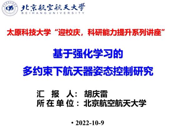 北京航空航天大学自动化科学与电气工程学院胡庆雷教授做了《基于强化学习的多约束下航天器姿态控制研究》的报告,考虑到航天在轨任务面临复杂约束条件以及性能优化的问题,给姿态控制系统的设计带来了巨大的挑战。针对这一问题,提出了一种基于强化学习的多约束下航天器姿态控制方法,能够同时解决运动复杂约束以及实时性能优化在轨姿态控制。同时,在理论上给出了稳定性和收敛性的保障,在应用层面通过数值仿真和地面实验系统验证了所提出的方法的有效性与优越性,能够实现安全、自主、高性能的航天器姿态机动控制。