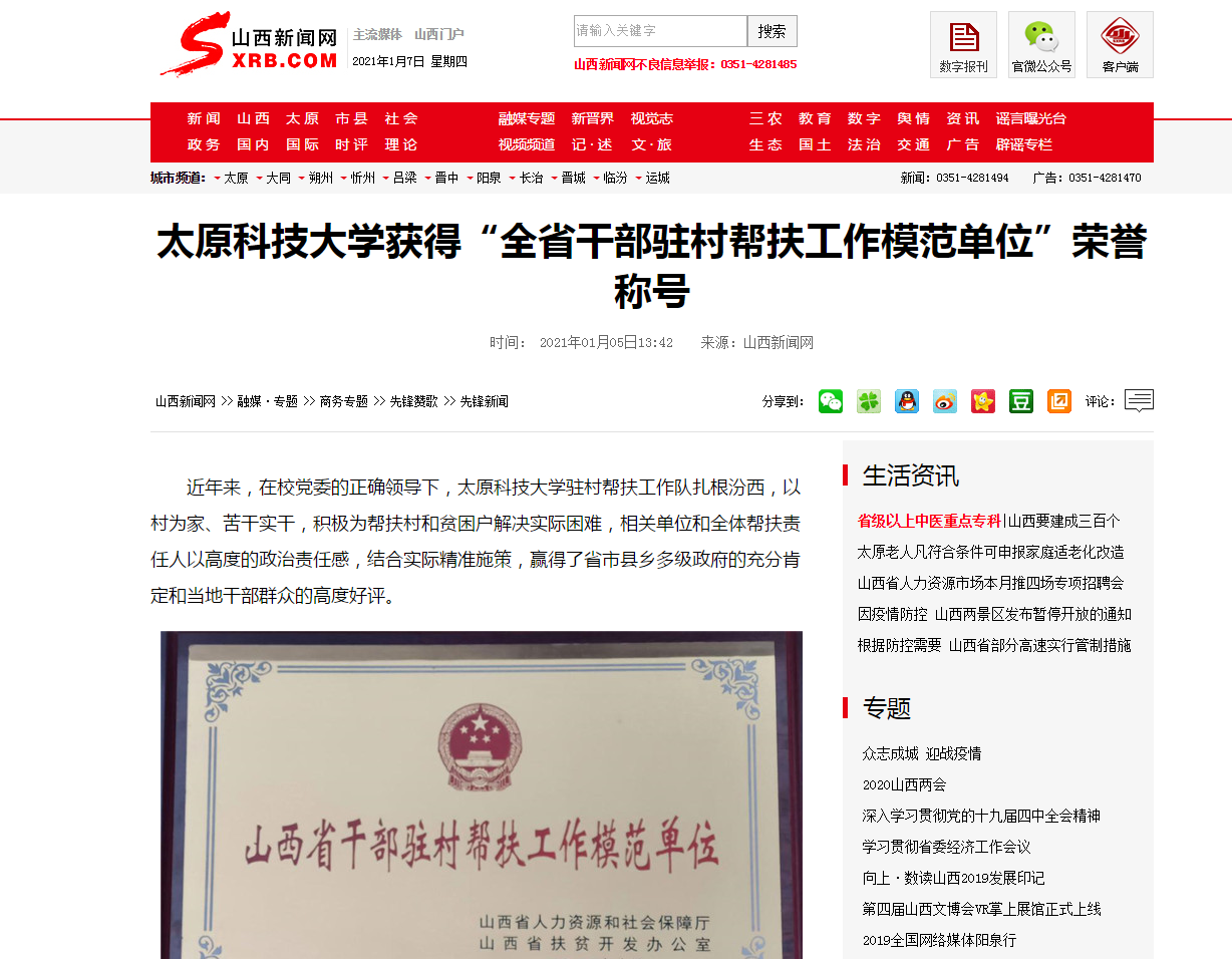 2021年1月5日,山西新闻网以《awc777万象城娱乐官网获得“全省干部驻村帮扶工作模范单位”荣誉称号》为题对万象城官网扶贫工作进行了报道。