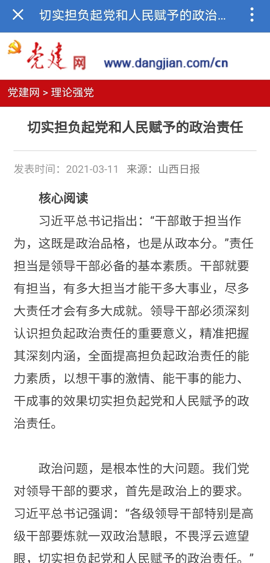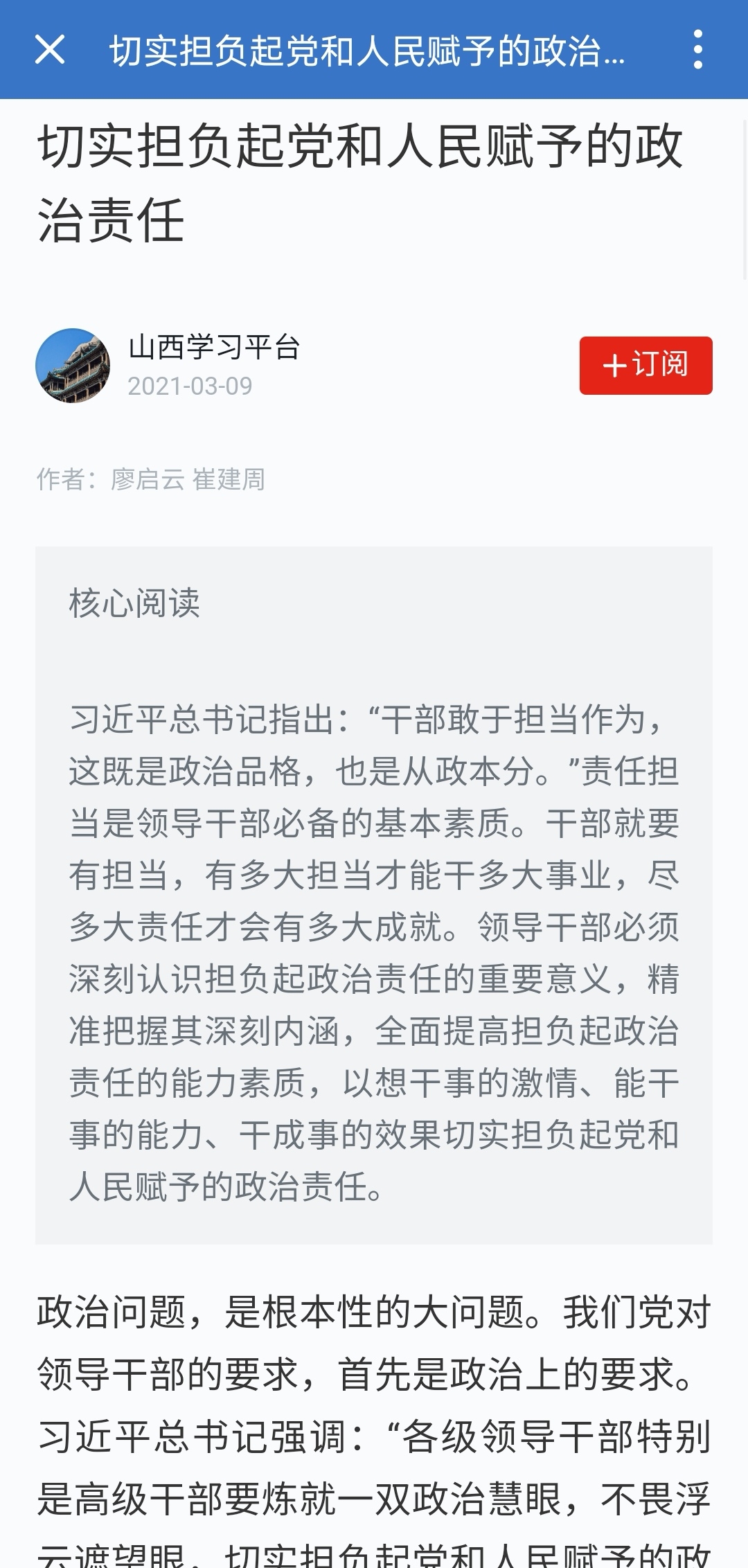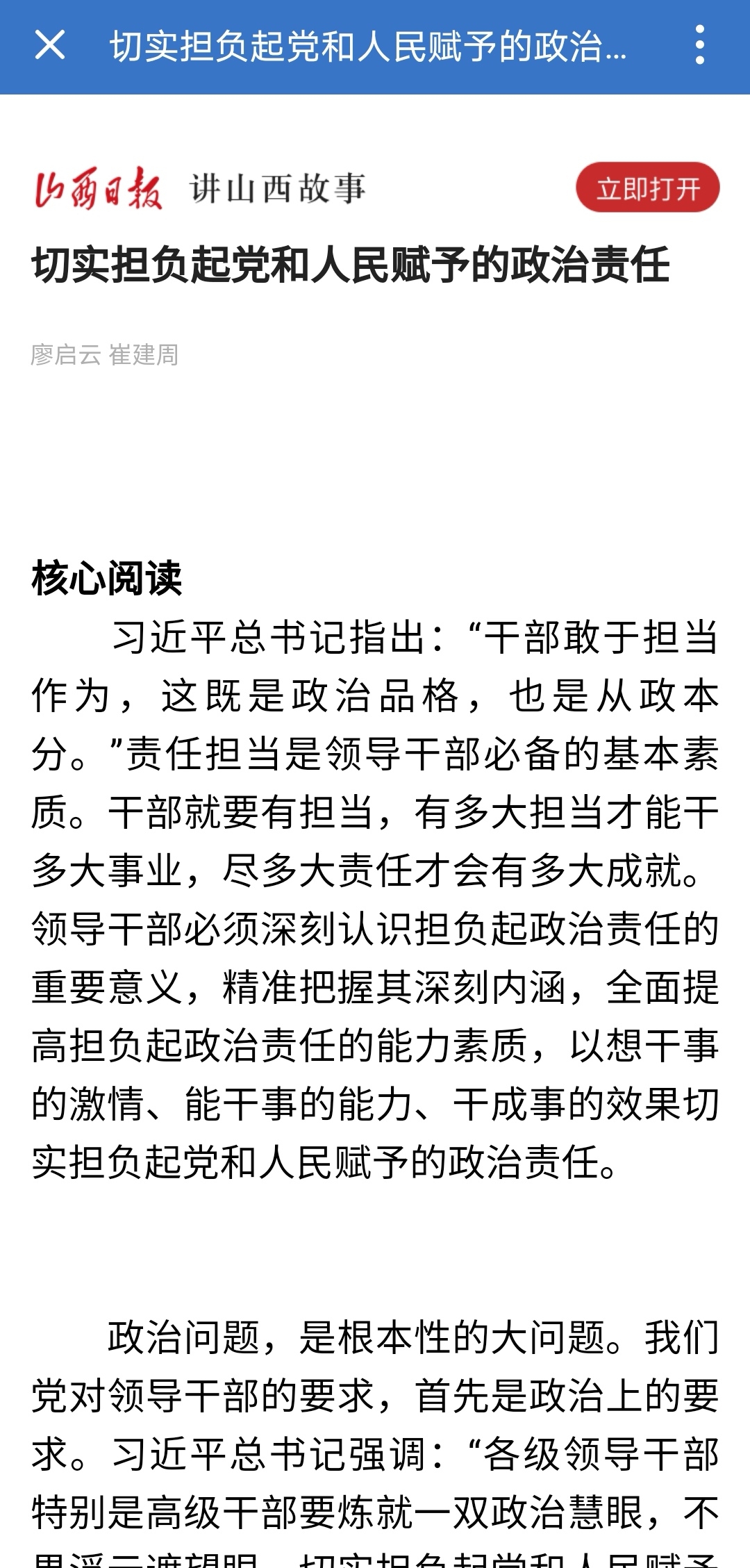 2021年3月9日的学习强国、2021年3月11日的山西日报、党建网都刊登了万象城官网廖启云教授等人撰写的文章《切实担负起党和人民赋予的政治责任》。