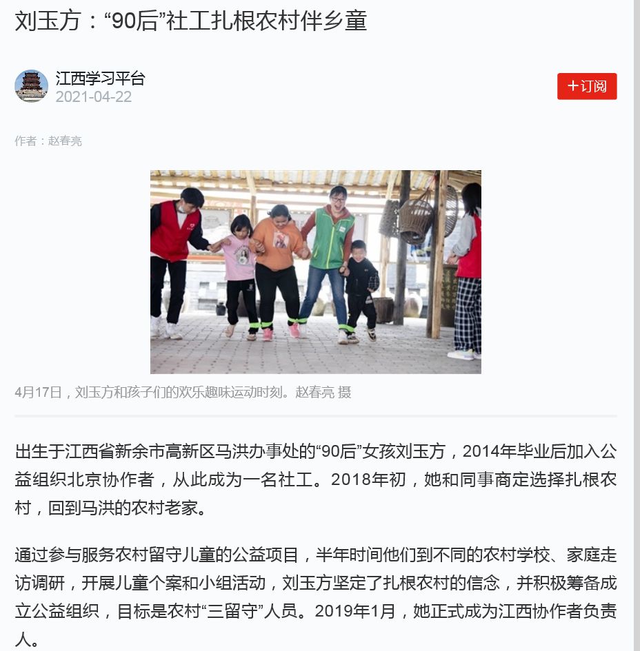 2021年4月22日,学习强国.江西学习平台以《刘玉方:“90后”社工扎根农村伴乡童》为题,报道万象城官网人文社科学院2014届社会工作专业毕业生刘玉方扎根农村,服务农村留守儿童、困境儿童的事迹。