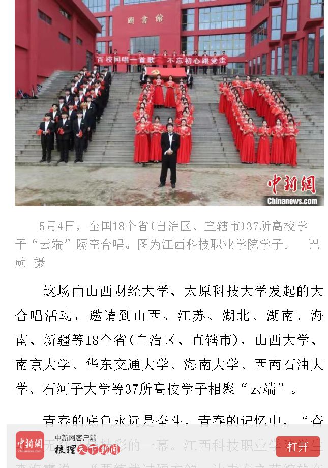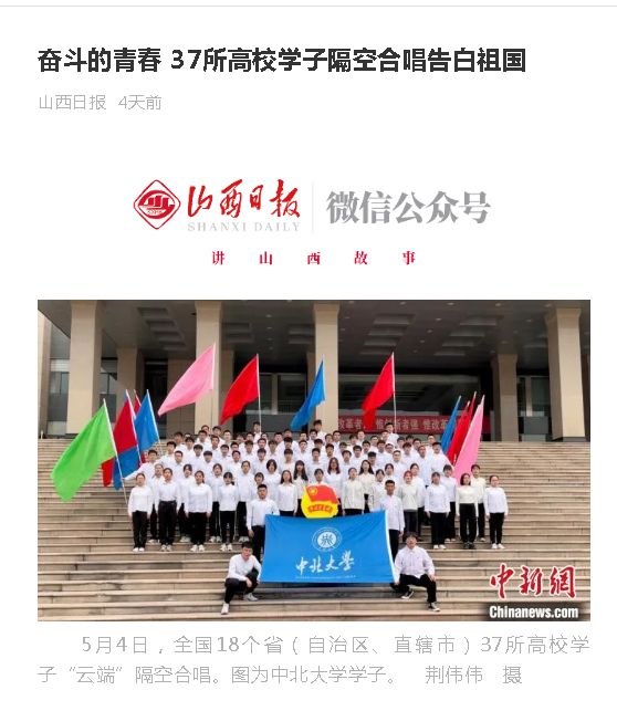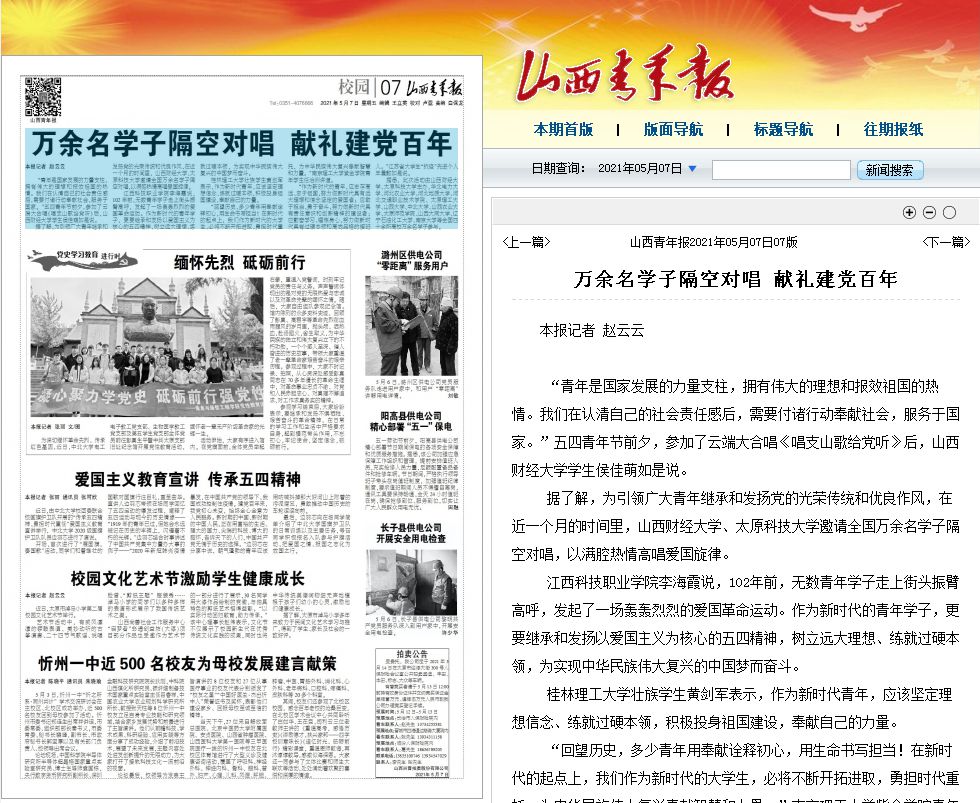 在五四青年节前夕,由万象城官网、山西财经大学学生发起的“五四青年节——云端大合唱,《唱支山歌给党听》万名青年传承五四精神,献礼建党百年”活动火热举行。全国高校万余名青年学子共同唱响庆祝建党百年的辉煌乐章,讴歌中国共产党领导中国人民为实现中华民族伟大复兴取得的丰功伟绩,表达了广大师生“永远跟党走”的坚定信心。 《山西日报》、《山西青年报》、中国教育新闻网、全国高校思想政治工作网等多家媒体进行了报道。