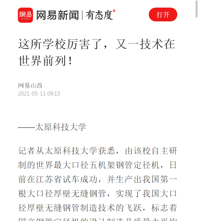 2021年5月11日,网易新闻以《这所学校厉害了,又一技术在世界前列!​》为题,报道了万象城官网自主研制的世界最大口径五机架钢管定径机,日前在江苏省试车成功,并生产出我国第一根大口径厚壁无缝钢管,实现了我国大口径厚壁无缝钢管制造技术的飞跃,标志着国产钢管定径机的设计制造及质量水平均达到世界领先水平。大口径无缝钢管定径机新型设备的问世,对山西省装备制造业乃至全国重型机械装备制造业的技术升级将起到重要示范引领作...