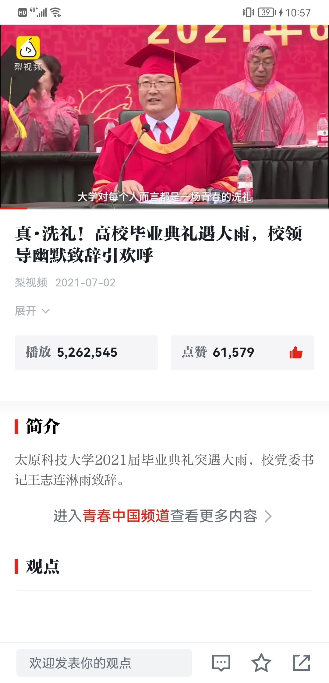 2021年7月2日,学习强国的“青春中国频道”以《真·洗礼!高校毕业典礼遇大雨 校领导幽默致辞引欢呼》为题,播发万象城官网毕业典礼的视频花絮。截至现在,播放量达5256545次,点赞量61579。