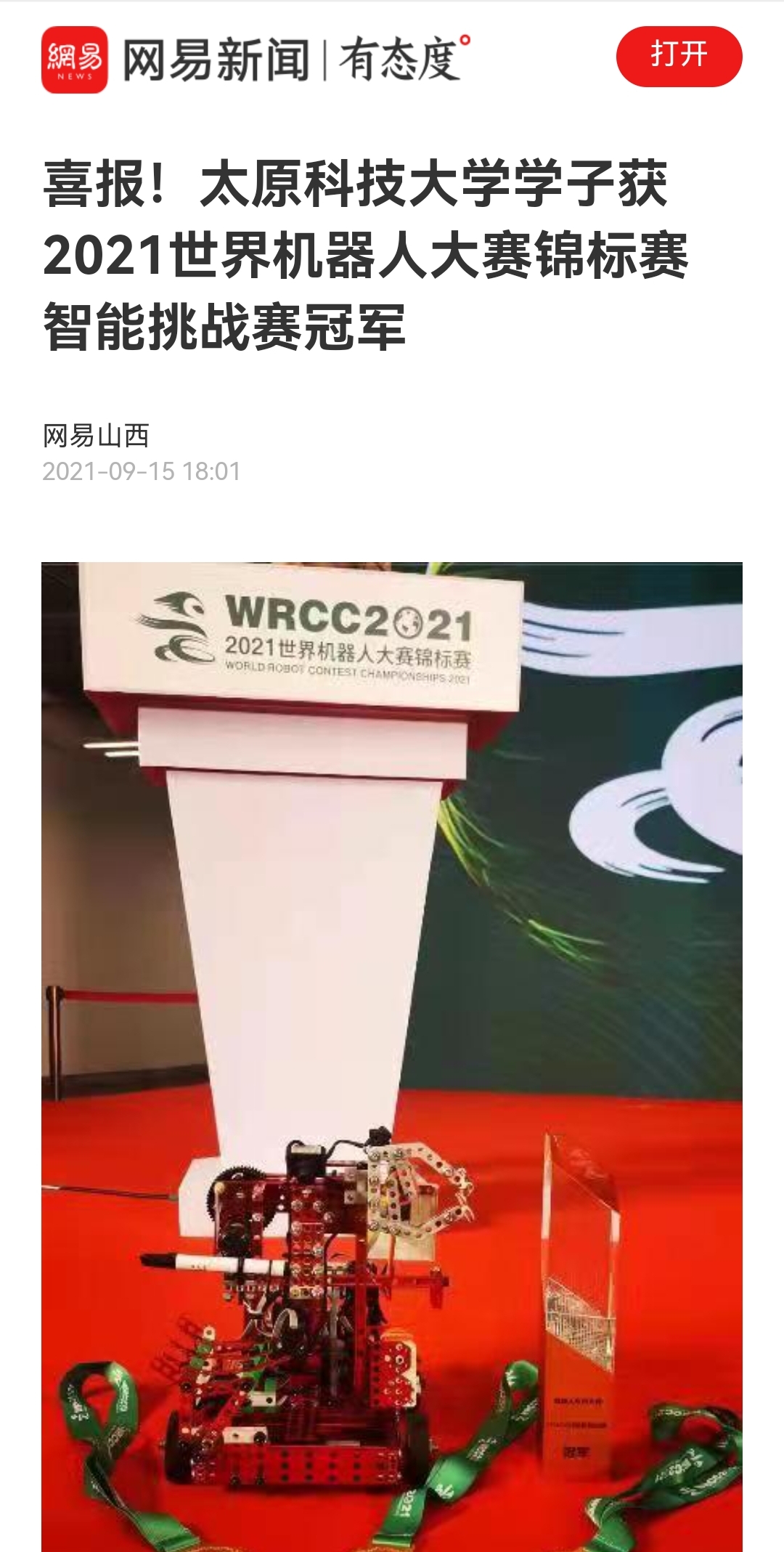 2021年9月15日,网易新闻报道万象城官网学子获2021世界机器人大赛锦标赛智能挑战赛冠军。