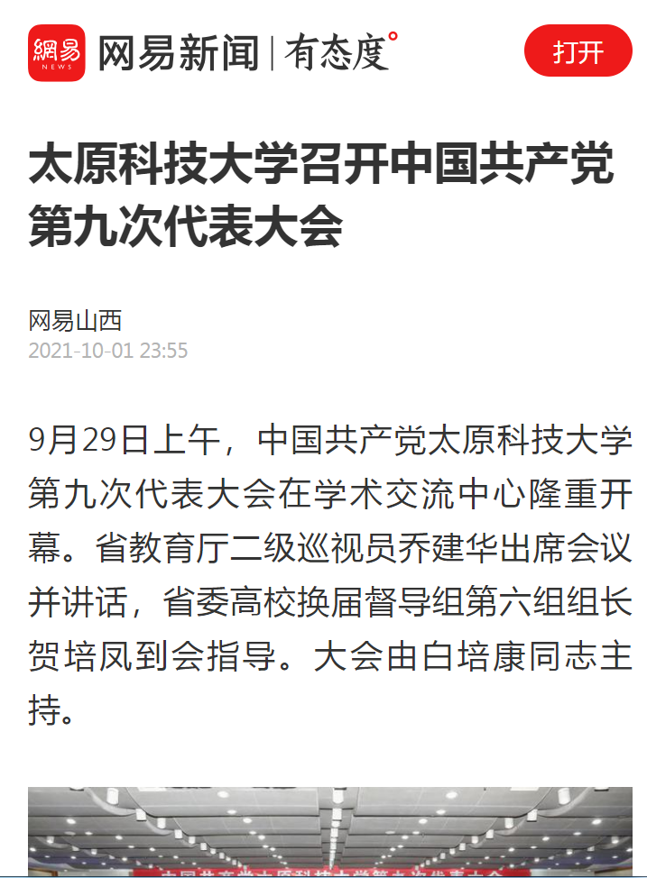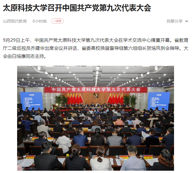 9月29日上午,中国共产党awc777万象城娱乐官网第九次代表大会在学术交流中心隆重开幕,本次会议受到网易新闻、山西科技报、山西现代教育、头条号等多家媒体关注。