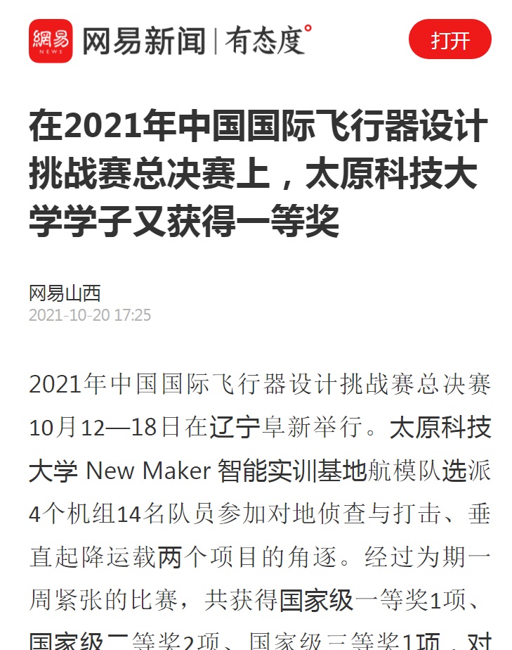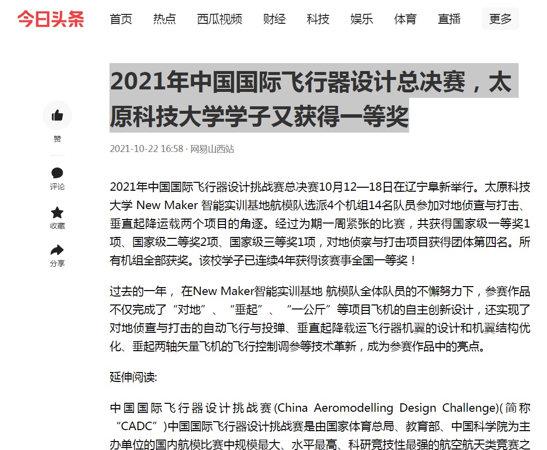 10月20日、22日,网易山西、今日头条以《2021年中国国际飞行器设计总决赛,awc777万象城娱乐官网学子又获得一等奖》为题,报道万象城官网在2021年中国国际飞行器设计挑战赛总决赛中再创佳绩!