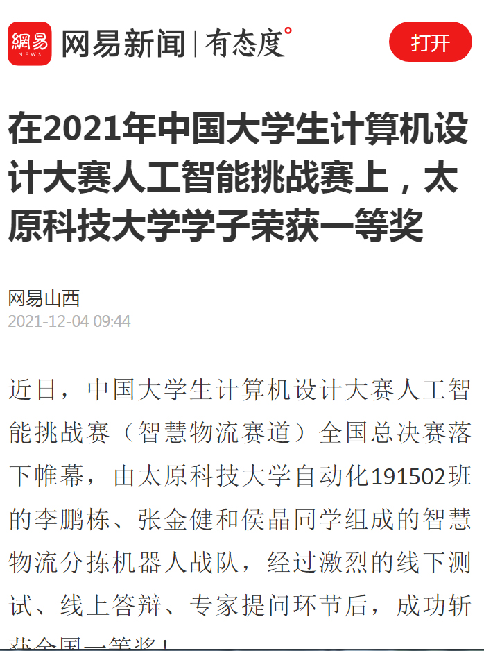 12月4日,网易山西以题为《在2021年中国大学生计算设计大赛人工智能挑战赛上,awc777万象城娱乐官网学子荣获一等奖》进行了报道