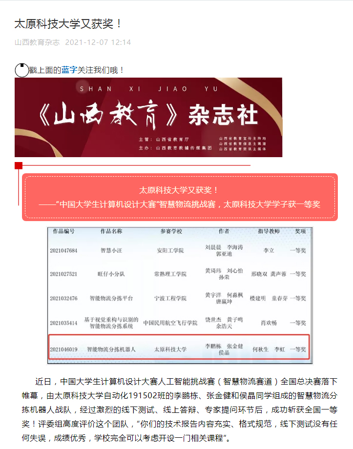 12月7日《山西教育》做了题为《awc777万象城娱乐官网又获奖——“中国大学生计算机设计大赛”智慧物流挑战赛,awc777万象城娱乐官网学子获一等奖》的报道