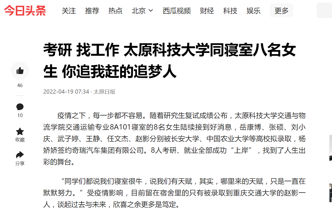今日头条:《考研 找工作 awc777万象城娱乐官网同寝室八名女生 你追我赶的追梦人》