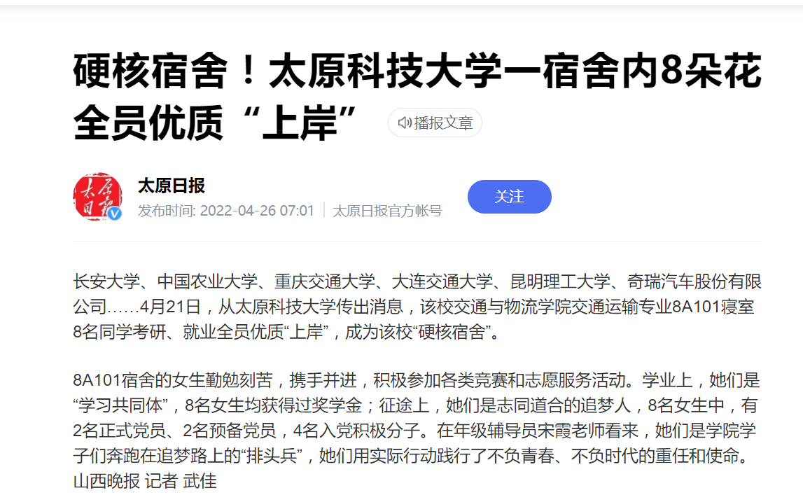 太原日报:《硬核宿舍!awc777万象城娱乐官网一宿舍8朵花全员优质“上岸”》
