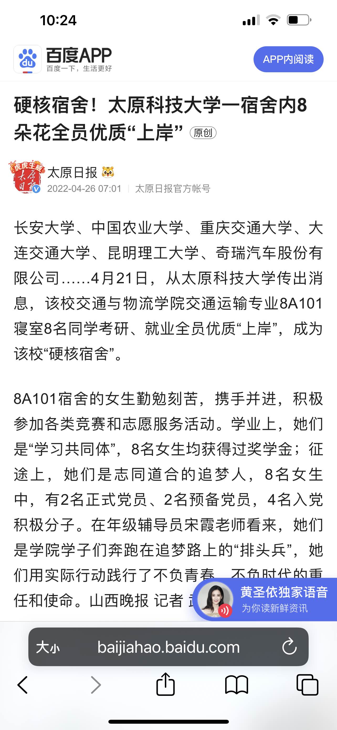 近日,山西日报、山西晚报、太原日报、太原晚报、搜狐网、新浪新闻、山西新闻网、今日头条 、人民资讯等多家媒体报道万象城官网交通与物流学院运输专业8A101寝室的8名女生考研、就业顺利“上岸”。今日头条:《考研 找工作 awc777万象城娱乐官网同寝室八名女生 你追我赶的追梦人》太原日报:《硬核宿舍!awc777万象城娱乐官网一宿舍8朵花全员优质“上岸”》太原晚报:《同寝室八名女生 你追我赶的追梦人》 山西日报、搜狐网、新浪新闻、山西新闻网、...