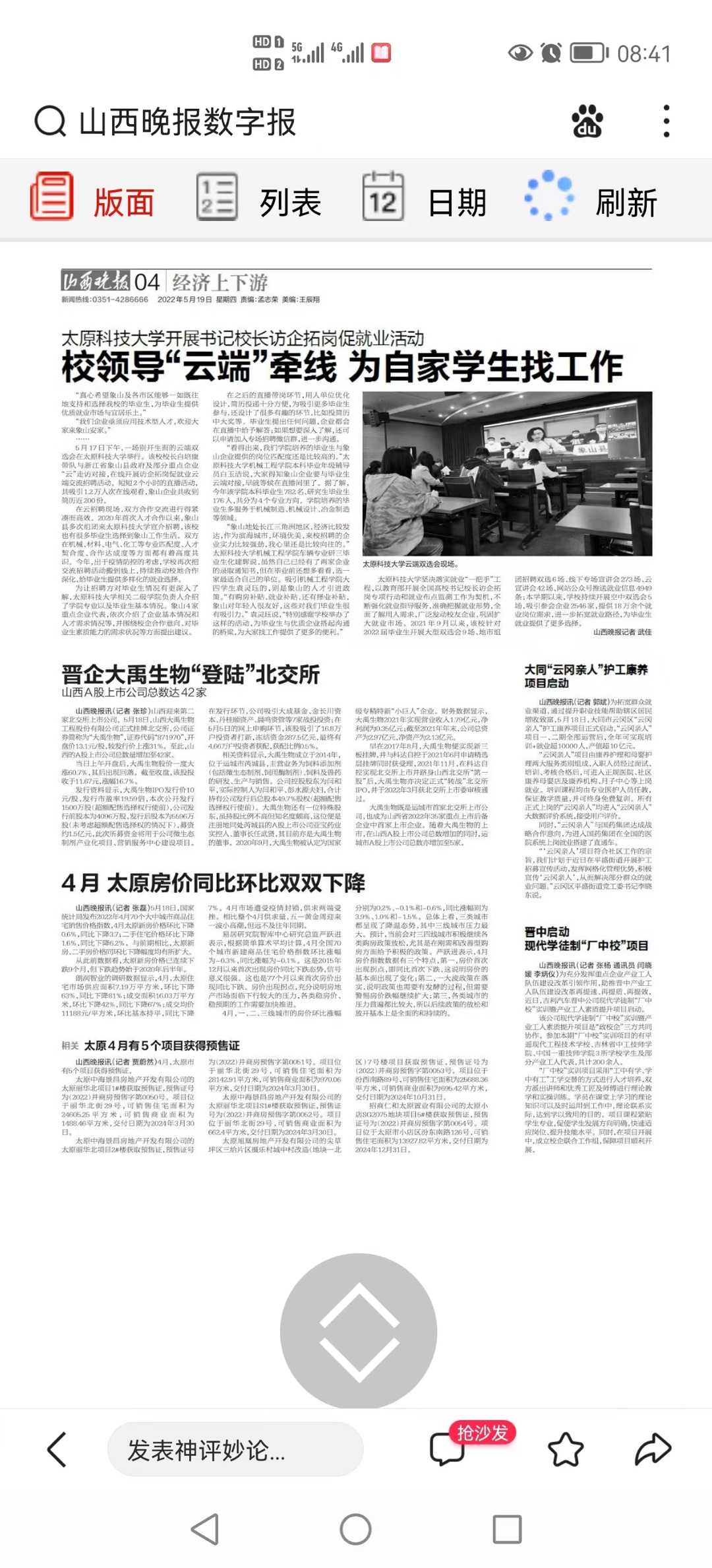 近日,学习强国、山西网络广播电视台、山西新闻网、《山西晚报》、《太原日报》等媒体对万象城官网5月17日的云端双选会进行了报道。5月2日,校长白培康带队与象山县政府及部分重点企业“云”走访对接,在线开展访企拓岗促就业云端交流招聘活动。短短2个小时的直播活动,共吸引1.2万人次在线观看,象山企业共收到简历近200份。学习强国以《awc777万象城娱乐官网:校长带队云端“做红娘”,单位学生搭起“连心桥”》为题进行了报道。《山西晚报...