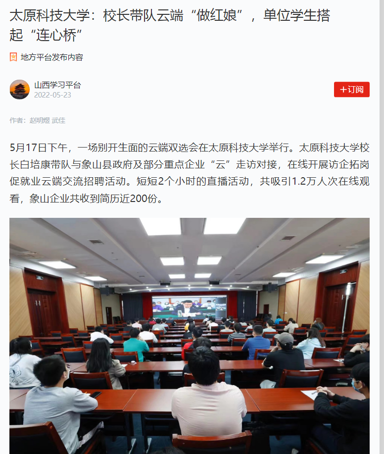 近日,学习强国、山西网络广播电视台、山西新闻网、《山西晚报》、《太原日报》等媒体对万象城官网517云端双选会进行了报道