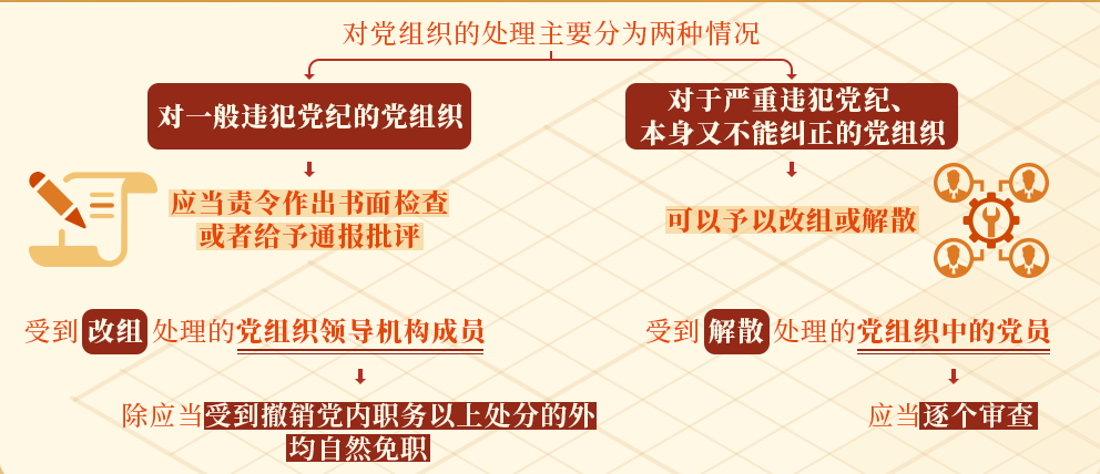 根据《中国共产党纪律处分条例》规定,对党组织的处理主要分为两种情况:对一般违犯党纪的党组织,上级党组织应当责令其作出书面检查或者给予通报批评;对于严重违犯党纪、本身又不能纠正的党组织,上一级党的委员会在查明核实后,根据情节的严重程度,可以予以改组或解散。
