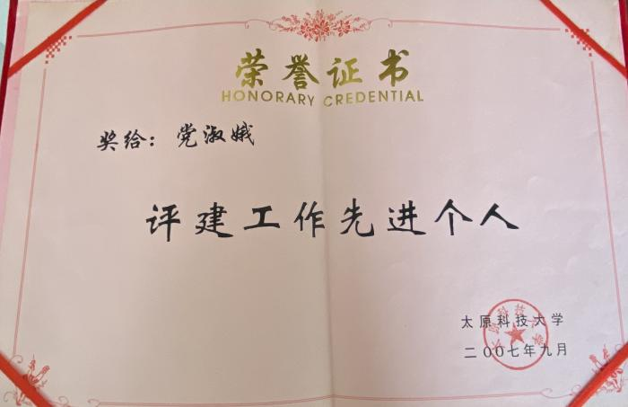 图注:党老师荣获学校“评建工作先进个人”荣誉称号