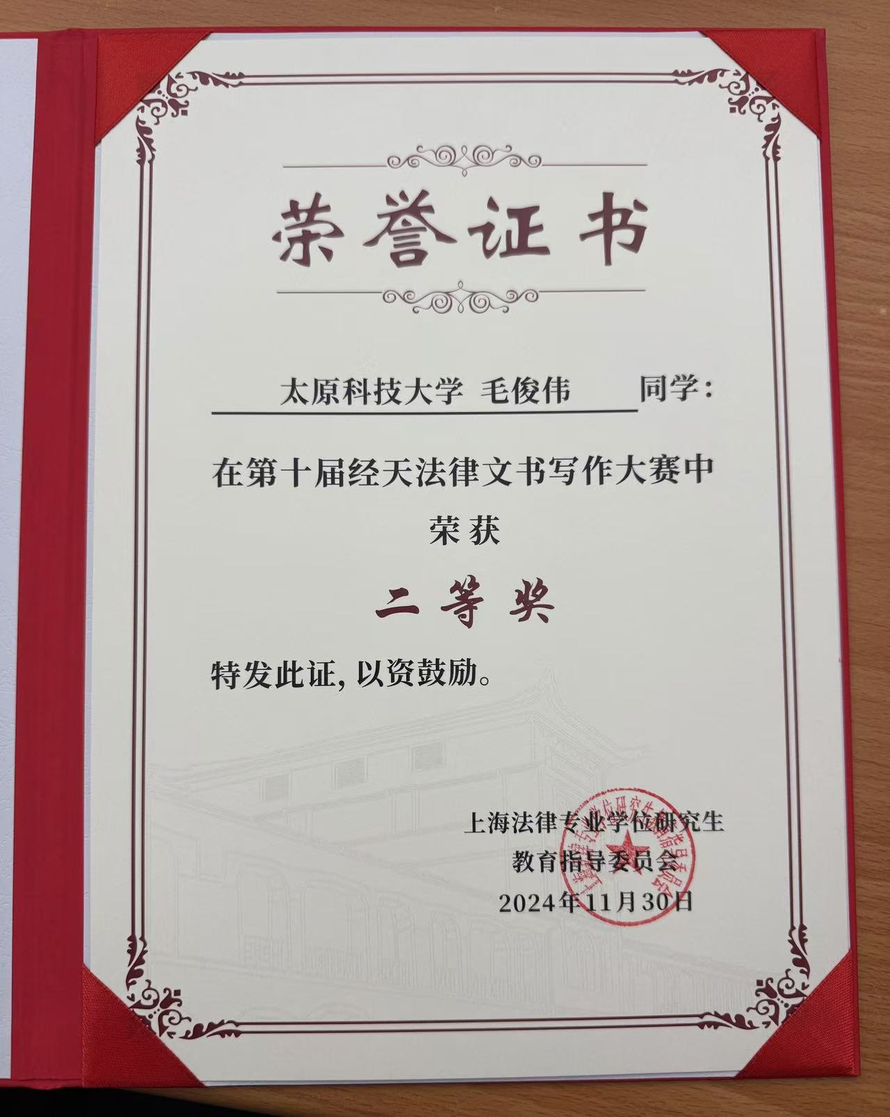 为提升法律专业研究生的专业素质和实践应用水平,11月30日,由上海市法律硕士专业学位研究生教育指导委员会主办、华东政法大学承办的第十届经天法律文书写作大赛决赛在华东政法大学长宁校区举行。万象城官网法学院2024级法律(法学)硕士研究生毛俊伟荣获二等奖!