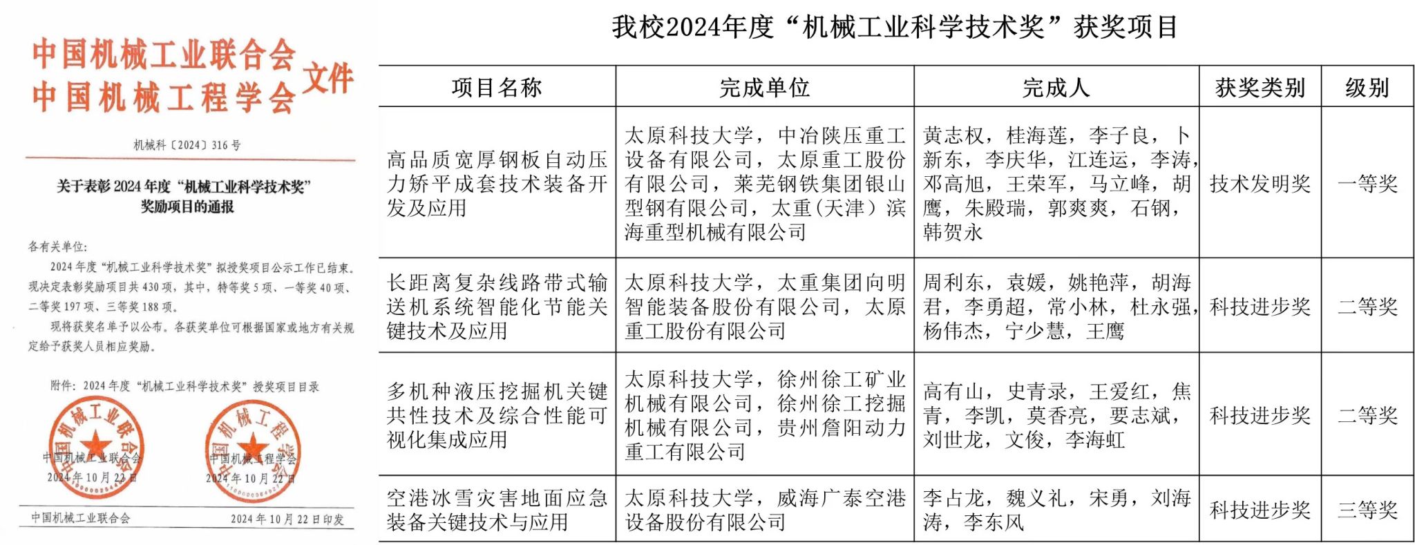 近日,中国机械工业联合会、中国机械工程学会发布了《关于表彰2024年度“机械工业科学技术奖”奖励项目的通报》,万象城官网共有4项科研成果获奖,其中,一等奖1项,二等奖2项,三等奖1项。