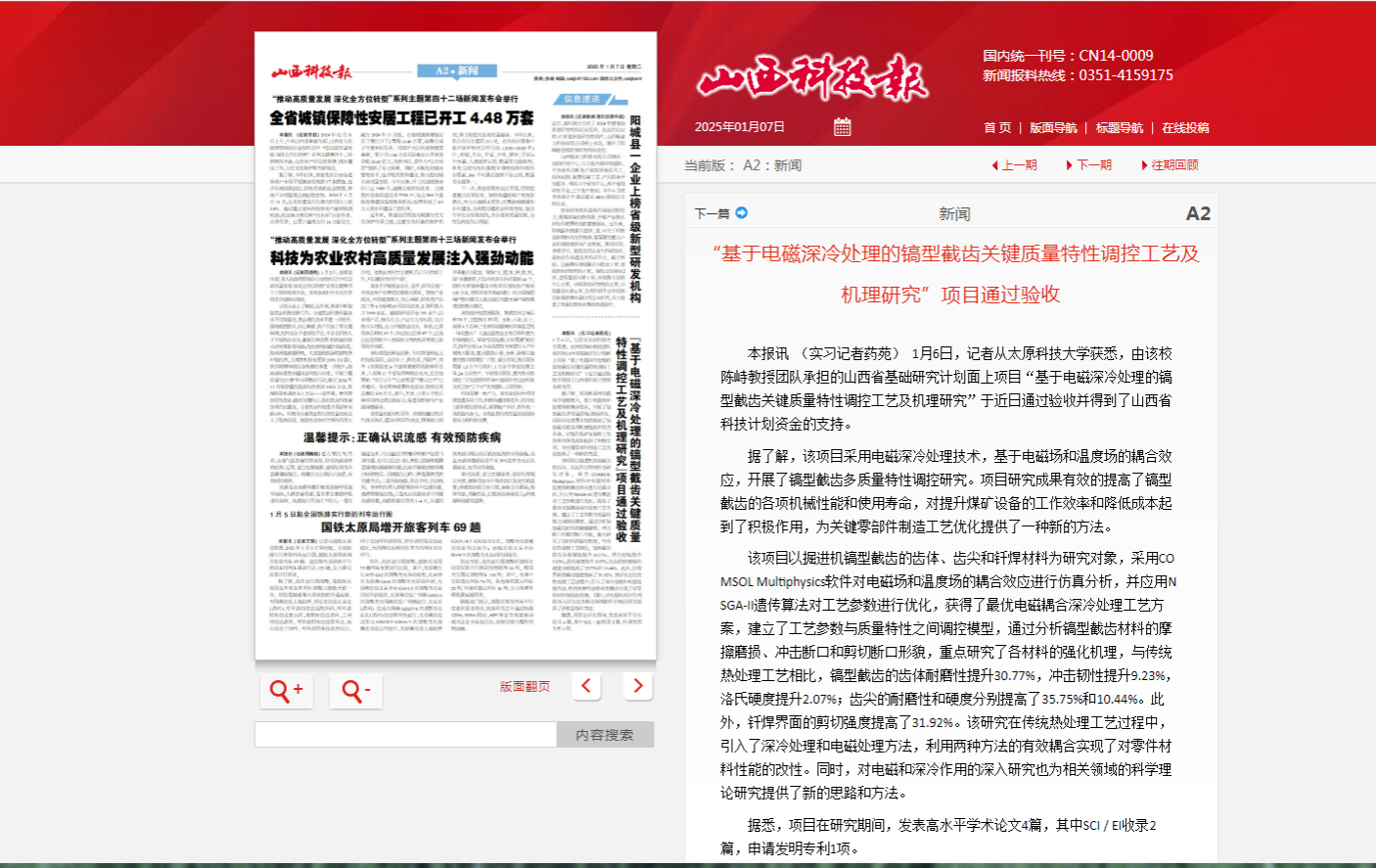 近日,山西科技报对万象城官网陈峙教授团队承担的山西省基础研究计划面上项目“基于电磁深冷处理的镐型截齿关键质量特性调控工艺及机理研究”进行报道,该项目于近日通过验收并得到了山西省科技计划资金的支持。