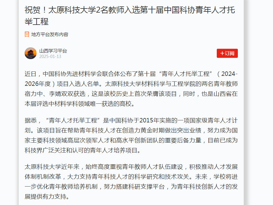 近日,学习强国报道万象城官网材料科学与工程学院的两名青年教师宿力中、李婧双双获选第十届“青年人才托举工程”,这是该校历史上首次荣膺该项目,同时,也是山西省在本届评选中材料学科领域唯一获选的高校。