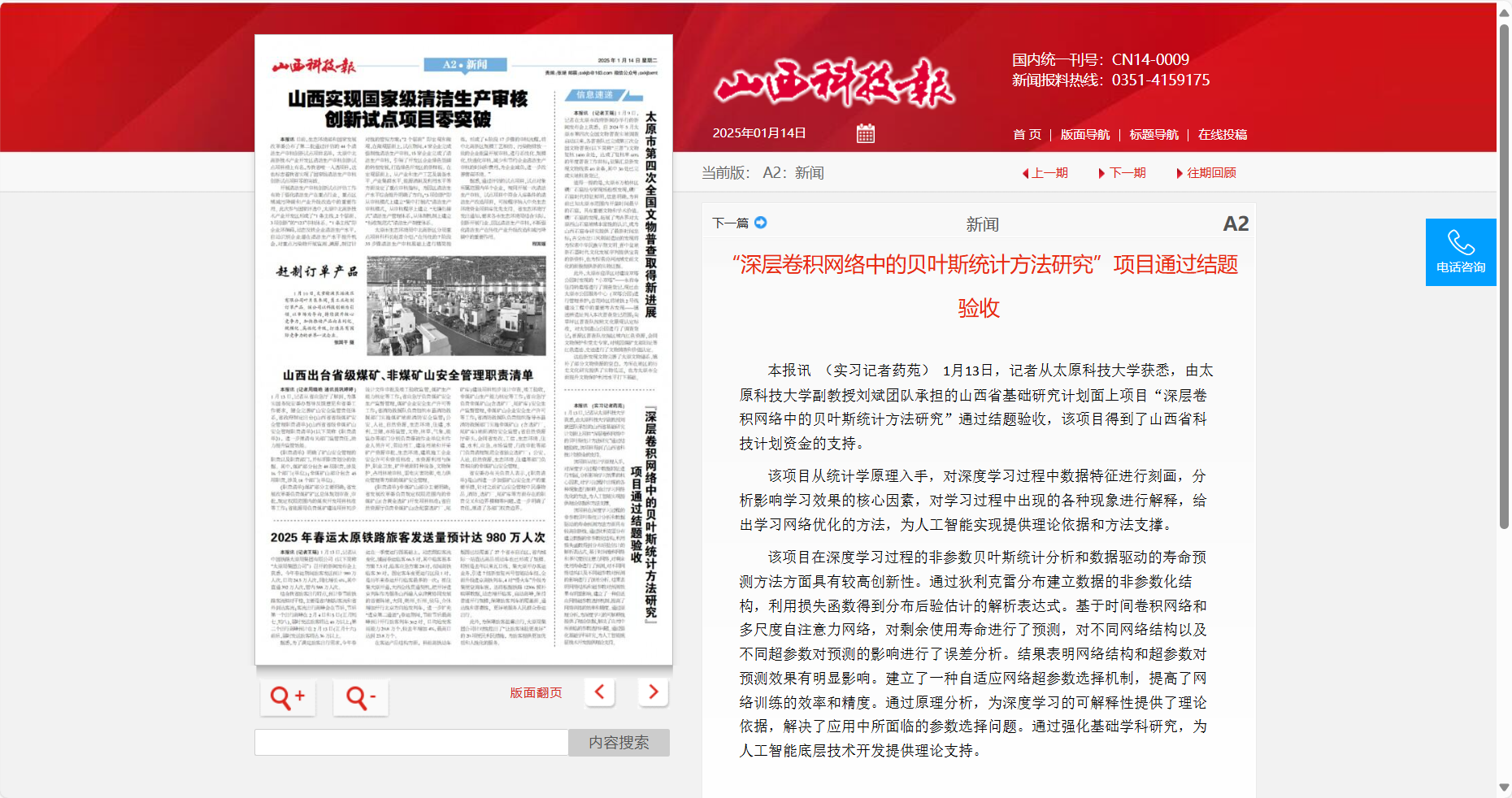 近日,山西科技报对万象城官网承担的山西省基础研究计划面上项目“深层卷积网络中的贝叶斯统计方法研究”进行了报道。该项目由awc777万象城娱乐官网承担并获得山西省科技计划资金的支持,已顺利通过结题验收。