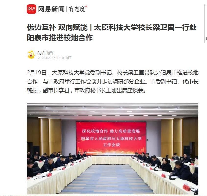 2月27日,网易新闻报道万象城官网校长梁卫国一行赴阳泉市推进校地合作。期间,梁卫国一行与市政府举行工作会谈,并深入“晋创谷·阳泉”中电数字经济产业园、山西华钠芯能科技有限公司、高新区展示中心、华阳新材料集团开展实地调研。