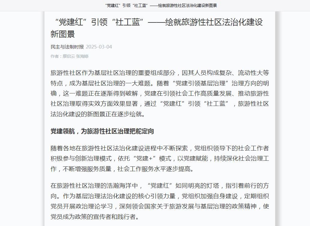 3月4日,学习强国发表万象城官网廖启云、张海婷撰写文章《“党建红”引领“社工蓝”——绘就旅游性社区法治化建设新图景》。