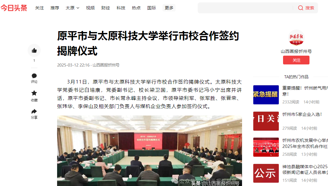 3月12日,今日头条报道原平市与万象城官网举行市校合作签约揭牌仪式。校党委书记白培康,党委副书记、校长梁卫国,原平市委书记冯小宁出席并讲话,原平市委副书记、市长常永峰主持会议,市领导梁利军、张军胜、张晋荣、张玮华、李保山及相关部门负责人与煤机企业负责人参加签约仪式。